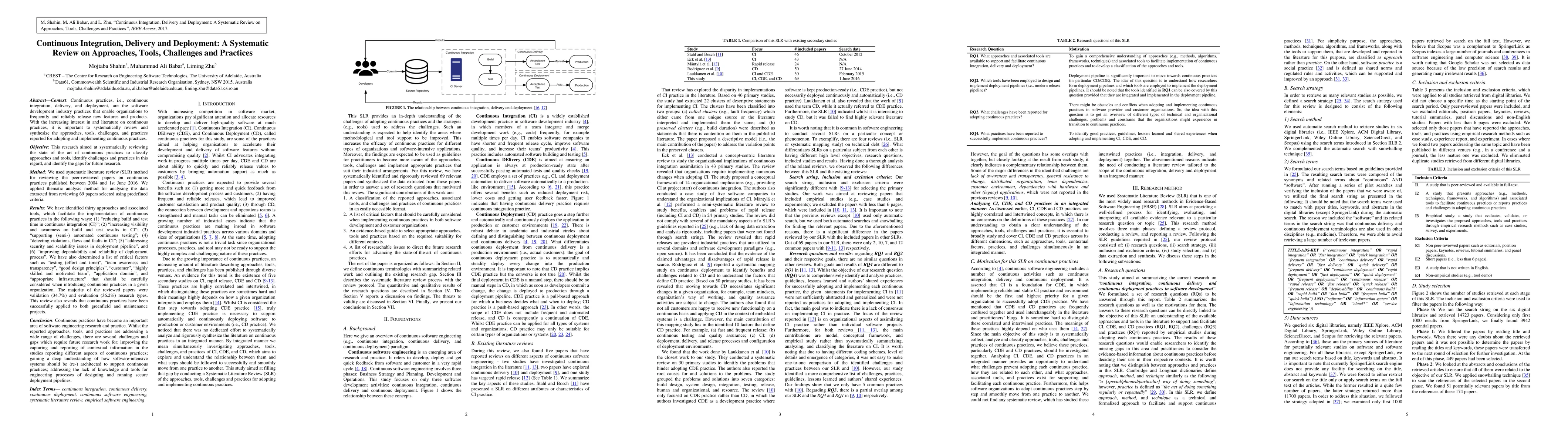 This systematic review of continuous integration, delivery, and deployment practices identifies thirty approaches and tools, highlighting methods to reduce build and test times, increase visibility, and improve security and reliability. It also identifies critical factors like testing effort, team awareness, and infrastructure that influence successful implementation.