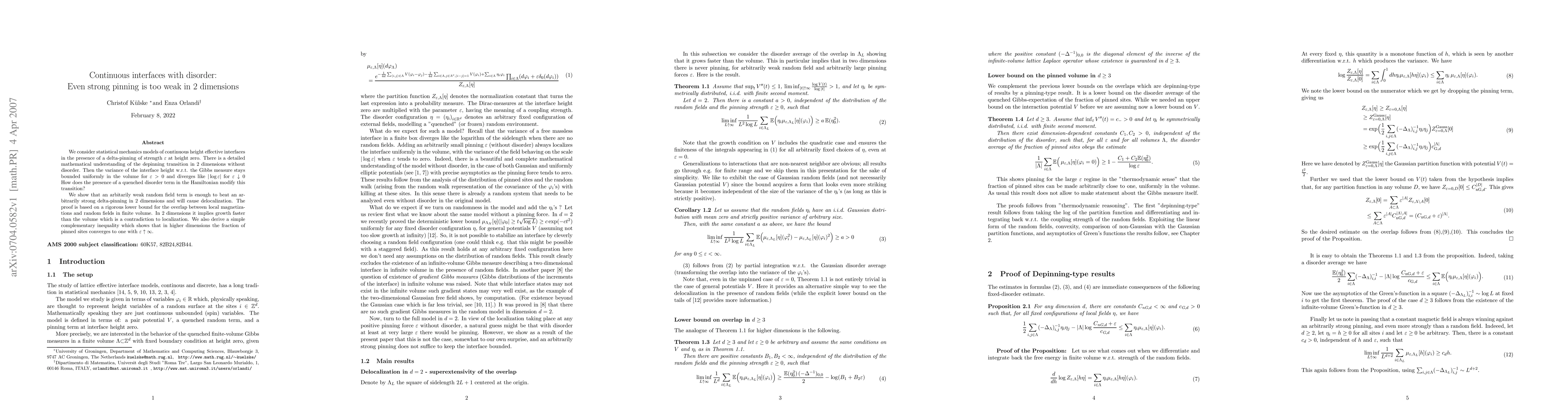 We consider statistical mechanics models of continuous height effective interfaces in the presence of a delta-pinning at height zero. There is a detailed mathematical understanding of the depinning transition in 2 dimensions without disorder. Then the variance of the interface height w.r.t. the Gibbs measure stays bounded uniformly in the volume for any positive pinning force and diverges like the logarithm of the pinning force when it tends to zero. How does the presence of a quenched disorder term in the Hamiltonian modify this transition? We show that an arbitarily weak random field term is enough to beat an arbitrarily strong delta-pinning in 2 dimensions and will cause delocalization. The proof is based on a rigorous lower bound for the overlap between local magnetizations and random fields in finite volume. In 2 dimensions it implies growth faster than the volume which is a contradiction to localization. We also derive a simple complementary inequality which shows that in higher dimensions the fraction of pinned sites converges to one when the pinning force tends to infinity.