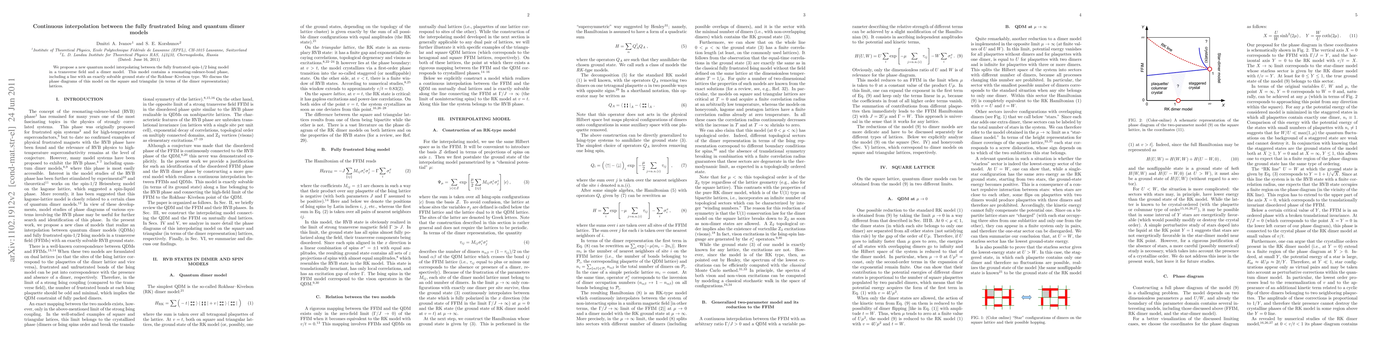 We propose a new quantum model interpolating between the fully frustrated spin-1/2 Ising model in a transverse field and a dimer model. This model contains a resonating-valence-bond phase, including a line with an exactly solvable ground state of the Rokhsar-Kivelson type. We discuss the phase diagrams of this model on the square and triangular (in terms of the dimer representation) lattices.