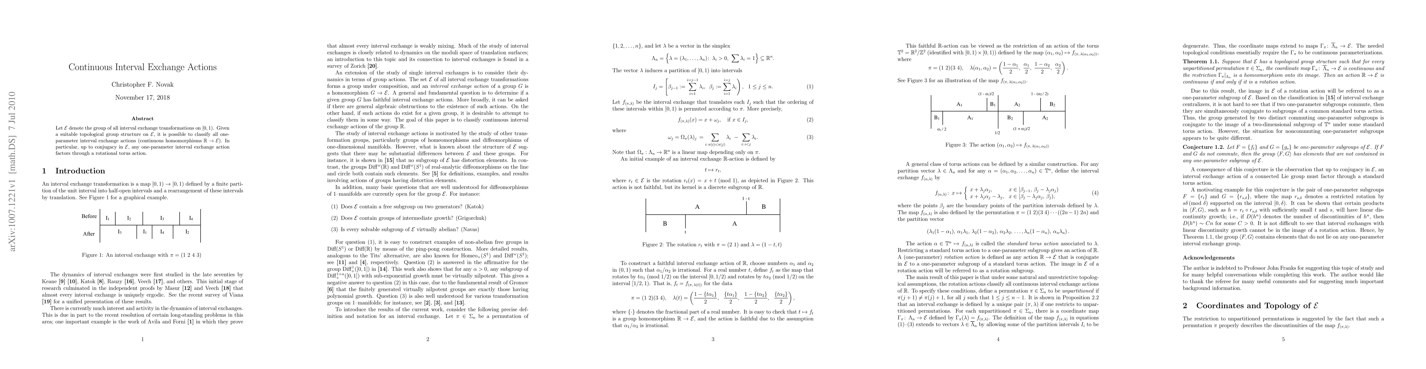 Let E denote the group of all interval exchange transformations on [0,1). Given a suitable topological group structure on E, it is possible to classify all one-parameter interval exchange actions (continuous homomorphisms from R to E). In particular, up to conjugacy in E, any one-parameter interval exchange action factors through a rotational torus action.
