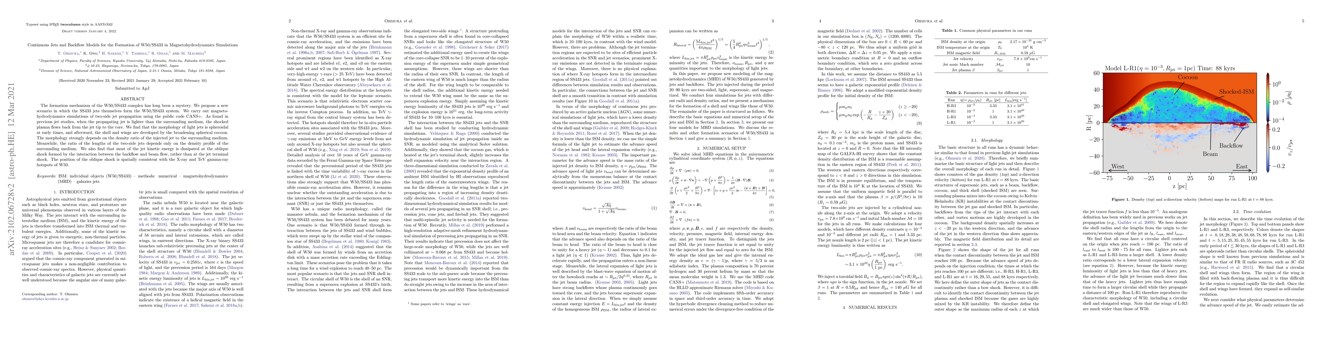 The formation mechanism of the W50/SS433 complex has long been a mystery. We propose a new scenario in which the SS433 jets themselves form the W50/SS433 system. We carry out magnetohydrodynamics simulations of two-side jet propagation using the public code CANS+. As found in previous jet studies, when the propagating jet is lighter than the surrounding medium, the shocked plasma flows back from the jet tip to the core. We find that the morphology of light jets is spheroidal at early times, and afterward, the shell and wings are developed by the broadening spherical cocoon. The morphology strongly depends on the density ratio of the injected jet to the surrounding medium. Meanwhile, the ratio of the lengths of the two-side jets depends only on the density profile of the surrounding medium. We also find that most of the jet kinetic energy is dissipated at the oblique shock formed by the interaction between the backflow and beam flow, rather than at the jet terminal shock. The position of the oblique shock is spatially consistent with the X-ray and TeV gamma-ray hotspots of W50.