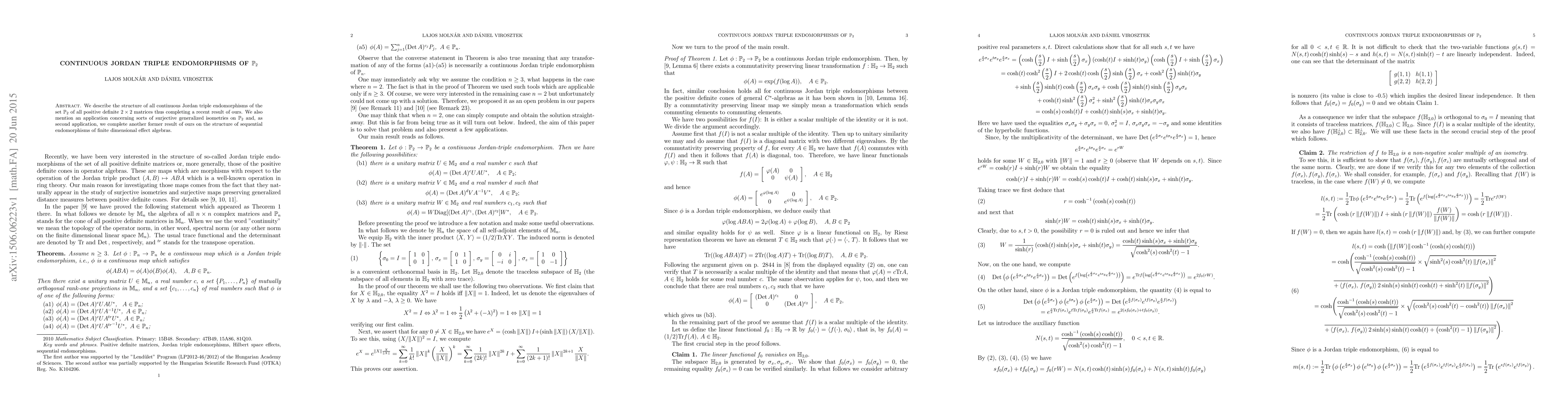 This paper characterizes the continuous Jordan triple endomorphisms of $\mathbb{P}_2$, the set of positive definite $2\times 2$ matrices, completing previous work. It also discusses applications to surjective generalized isometries on $\mathbb{P}_2$ and finalizes another study on sequential endomorphisms in finite-dimensional effect algebras.