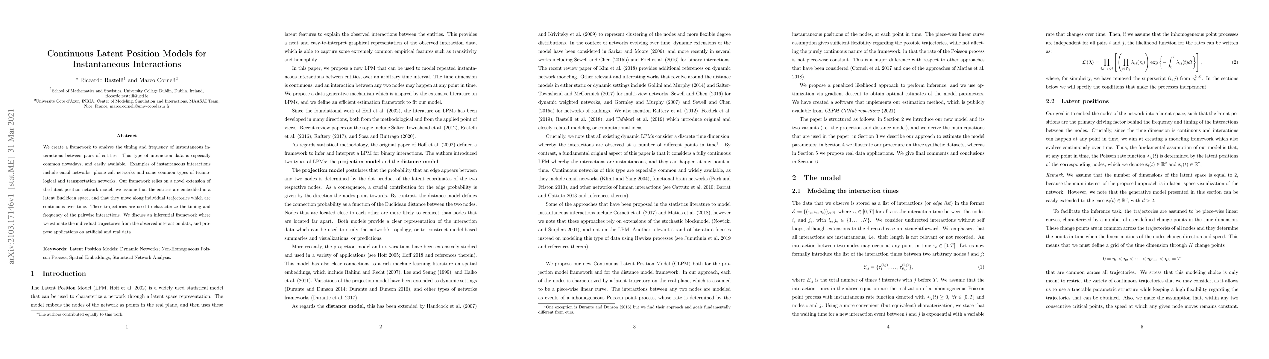 We create a framework to analyse the timing and frequency of instantaneous interactions between pairs of entities. This type of interaction data is especially common nowadays, and easily available. Examples of instantaneous interactions include email networks, phone call networks and some common types of technological and transportation networks. Our framework relies on a novel extension of the latent position network model: we assume that the entities are embedded in a latent Euclidean space, and that they move along individual trajectories which are continuous over time. These trajectories are used to characterize the timing and frequency of the pairwise interactions. We discuss an inferential framework where we estimate the individual trajectories from the observed interaction data, and propose applications on artificial and real data.