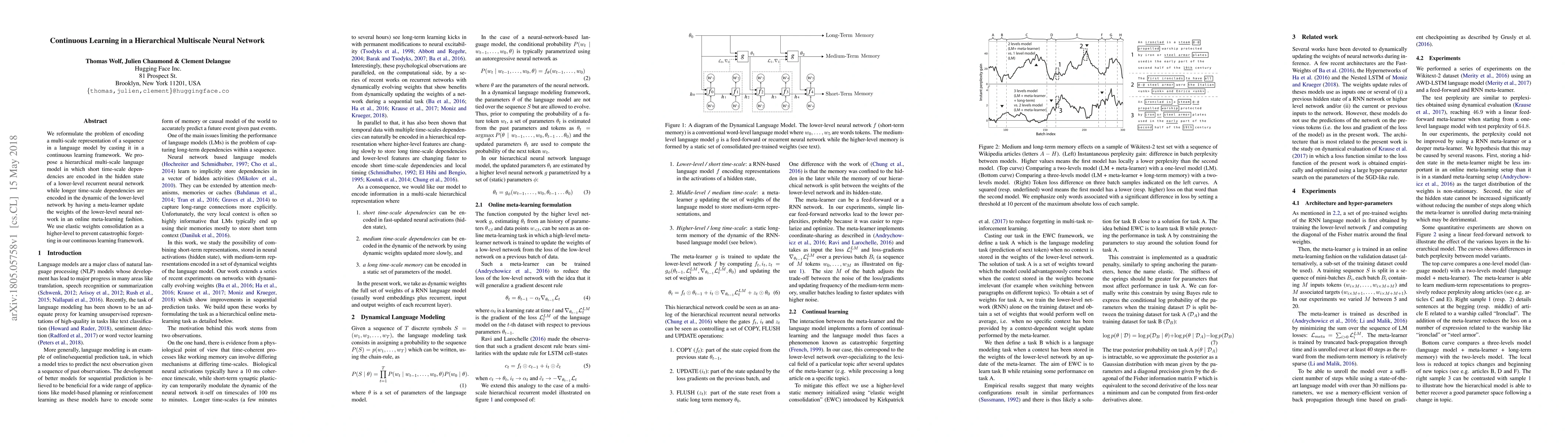 This paper proposes a hierarchical multi-scale language model for continuous learning that uses a lower-level RNN to encode short-term dependencies and a meta-learner to manage long-term dependencies, with elastic weights consolidation to mitigate catastrophic forgetting.