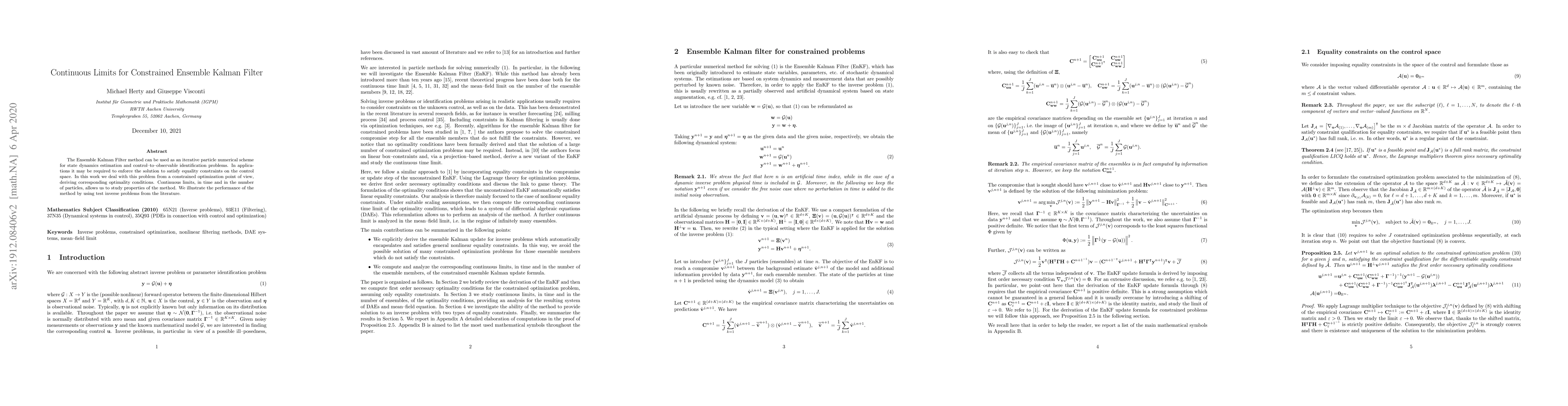 The Ensemble Kalman Filter method can be used as an iterative particle numerical scheme for state dynamics estimation and control--to--observable identification problems. In applications it may be required to enforce the solution to satisfy equality constraints on the control space. In this work we deal with this problem from a constrained optimization point of view, deriving corresponding optimality conditions. Continuous limits, in time and in the number of particles, allows us to study properties of the method. We illustrate the performance of the method by using test inverse problems from the literature.