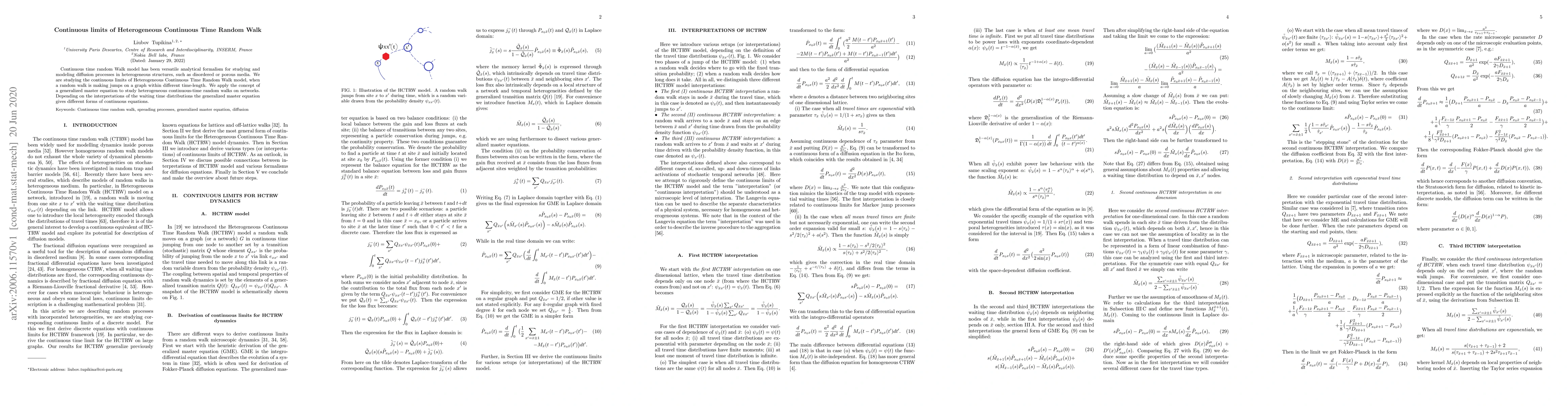 The paper derives the continuous limits of the Heterogeneous Continuous Time Random Walk (HCTRW) model using a generalized master equation (GME) approach, considering various interpretations based on waiting time distributions.