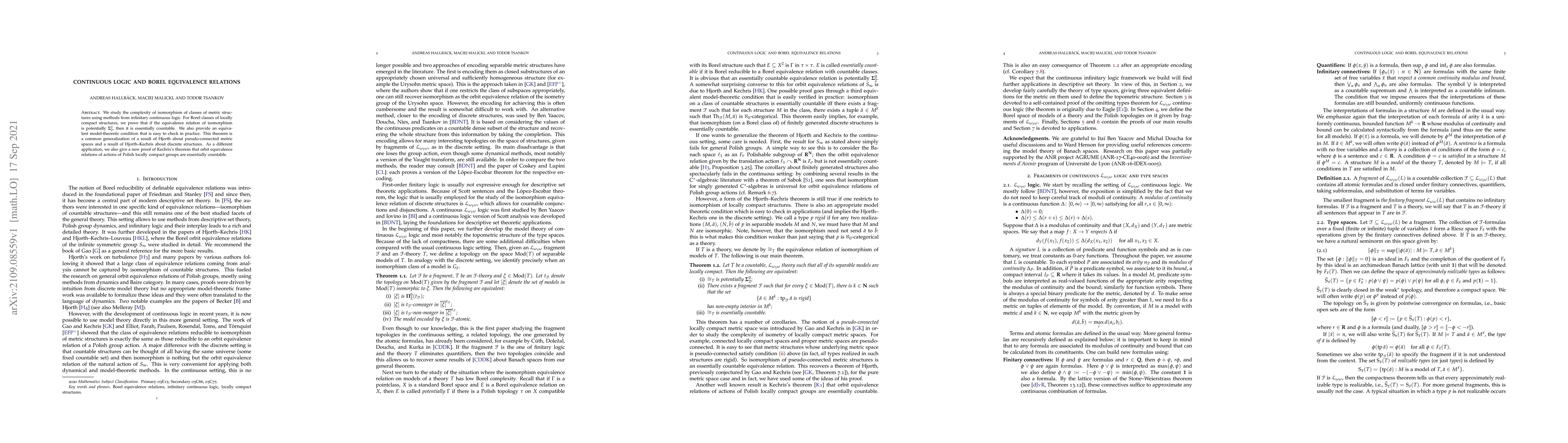 A study on isomorphism of classes of metric structures using infinitary continuous logic finds that Borel equivalence relations with a potentially $oldsymbol{ ext{\Sigma}^0_2}$ condition are essentially countable. This has implications for understanding the complexity and properties of various types of metric spaces.