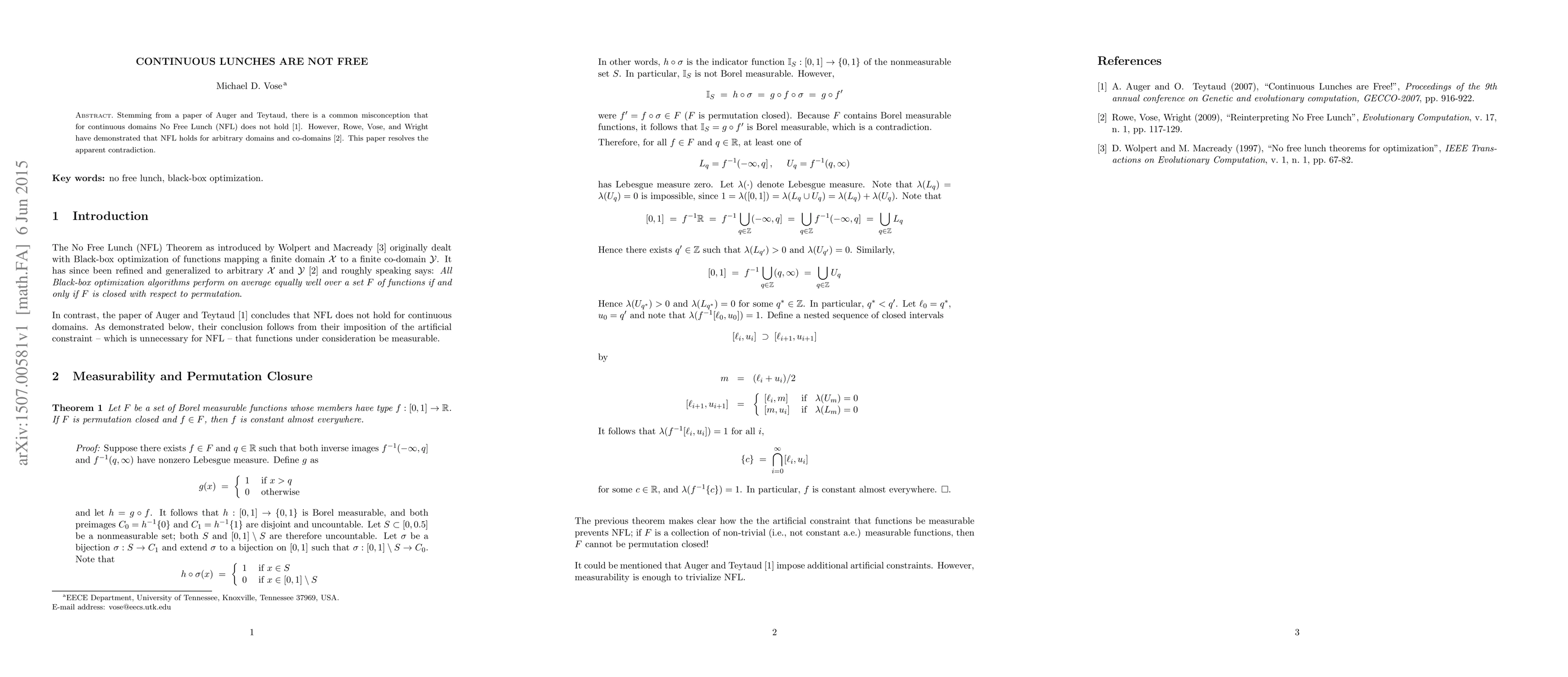 Stemming from a paper of Auger and Teytaud, there is a common misconception that for continuous domains No Free Lunch (NFL) does not hold. However, Rowe, Vose, and Wright have demonstrated that NFL holds for arbitrary domains and co-domains. This paper resolves the apparent contradiction.