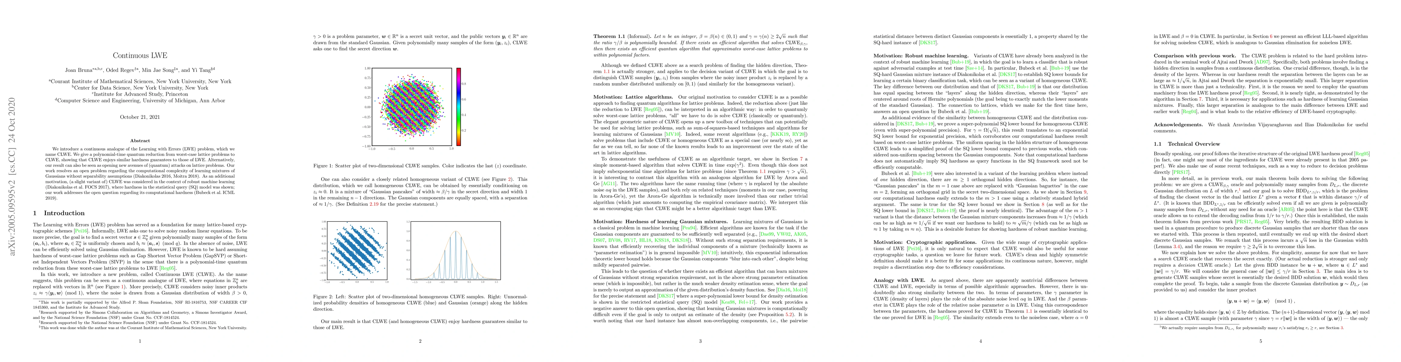 This paper introduces the Continuous Learning with Errors (CLWE) problem, providing a polynomial-time quantum reduction from worst-case lattice problems to CLWE, indicating similar hardness guarantees. It also resolves open questions on the computational complexity of learning mixtures of Gaussians and addresses the computational hardness of CLWE in the statistical query model.