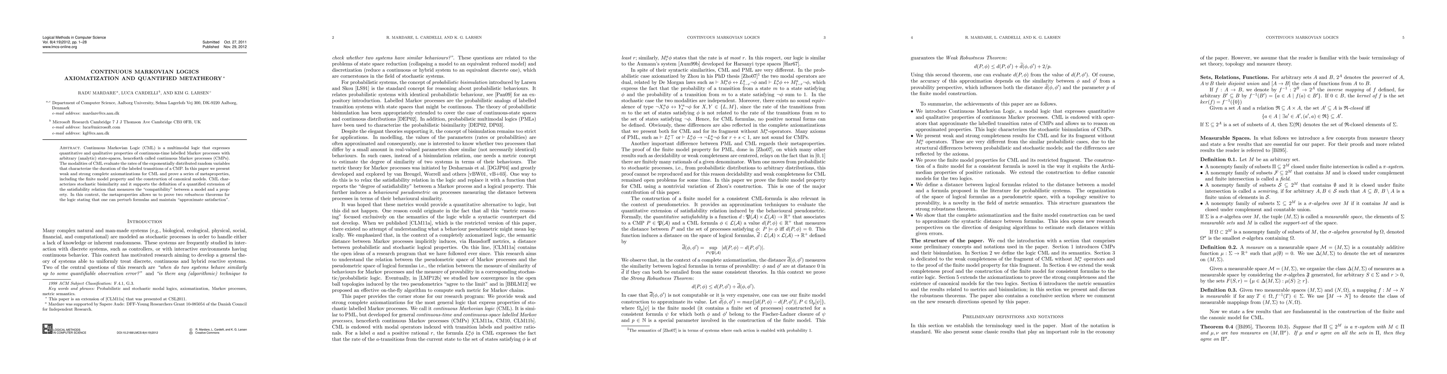 Continuous Markovian Logic (CML) is a multimodal logic that expresses quantitative and qualitative properties of continuous-time labelled Markov processes with arbitrary (analytic) state-spaces, henceforth called continuous Markov processes (CMPs). The modalities of CML evaluate the rates of the exponentially distributed random variables that characterize the duration of the labeled transitions of a CMP. In this paper we present weak and strong complete axiomatizations for CML and prove a series of metaproperties, including the finite model property and the construction of canonical models. CML characterizes stochastic bisimilarity and it supports the definition of a quantified extension of the satisfiability relation that measures the "compatibility" between a model and a property. In this context, the metaproperties allows us to prove two robustness theorems for the logic stating that one can perturb formulas and maintain "approximate satisfaction".