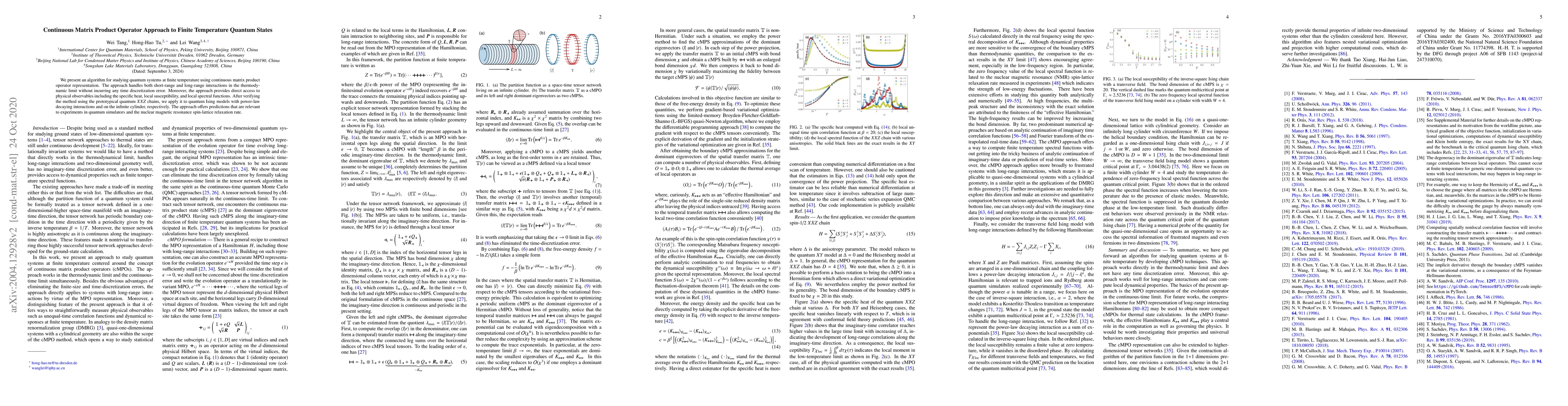 This paper introduces an algorithm for studying finite temperature quantum systems using continuous matrix product operator representation, which accurately handles interactions and provides access to physical observables without time discretization errors. The method is validated on quantum XXZ chains and applied to Ising models with power-law interactions, offering predictions relevant for quantum simulators and NMR experiments.