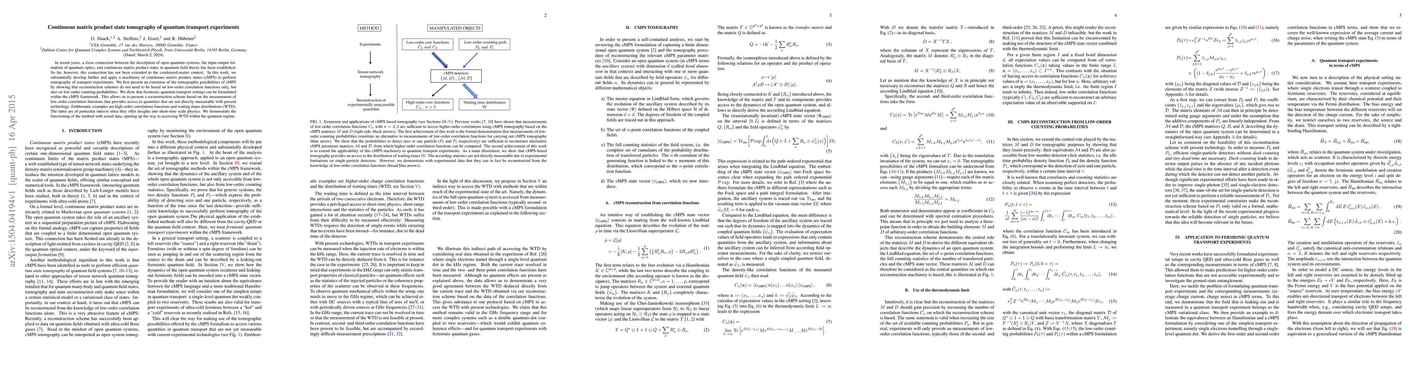 In recent years, a close connection between the description of open quantum systems, the input-output formalism of quantum optics, and continuous matrix product states in quantum field theory has been established. So far, however, this connection has not been extended to the condensed-matter context. In this work, we substantially develop further and apply a machinery of continuous matrix product states (cMPS) to perform tomography of transport experiments. We first present an extension of the tomographic possibilities of cMPS by showing that reconstruction schemes do not need to be based on low-order correlation functions only, but also on low-order counting probabilities. We show that fermionic quantum transport settings can be formulated within the cMPS framework. This allows us to present a reconstruction scheme based on the measurement of low-order correlation functions that provides access to quantities that are not directly measurable with present technology. Emblematic examples are high-order correlations functions and waiting times distributions (WTD). The latter are of particular interest since they offer insights into short-time scale physics. We demonstrate the functioning of the method with actual data, opening up the way to accessing WTD within the quantum regime.
