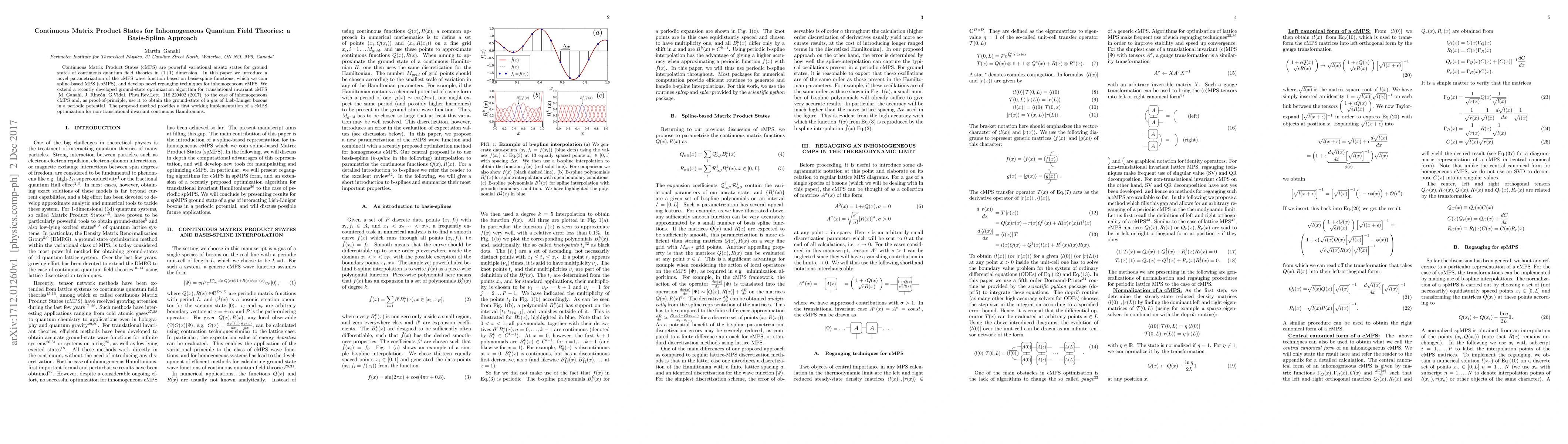 This paper introduces a novel basis-spline parametrization for continuous Matrix Product States (cMPS) called spline-based MPS (spMPS) and develops new regauging techniques for inhomogeneous cMPS. It extends an existing optimization algorithm to non-translational invariant systems, demonstrating its effectiveness by computing the ground state of a gas of Lieb-Liniger bosons in a periodic potential.