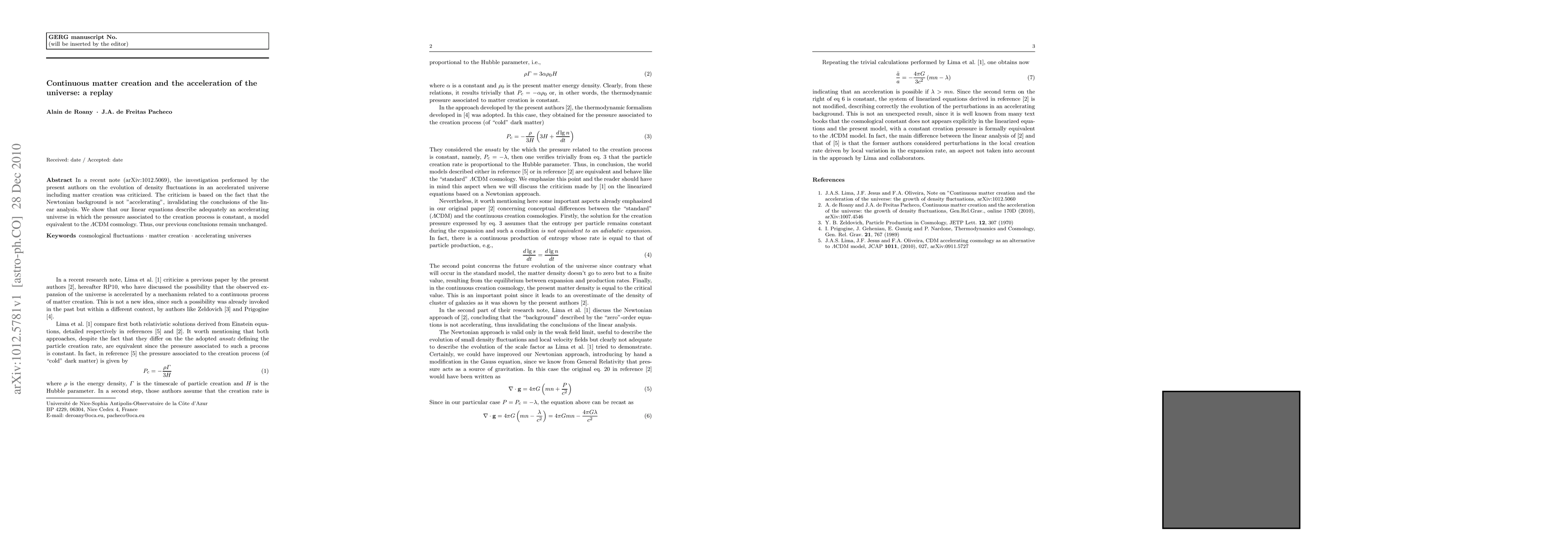 In a recent note (arXiv:1012.5069), the investigation performed by the present authors on the evolution of density fluctuations in an accelerated universe including matter creation was criticized. The criticism is based on the fact that the Newtonian background is not "accelerating", invalidating the conclusions of the linear analysis. We show that our linear equations describe adequately an accelerating universe in which the pressure associated to the creation process is constant, a model equivalent to the $\Lambda$CDM cosmology. Thus, our previous conclusions remain unchanged.