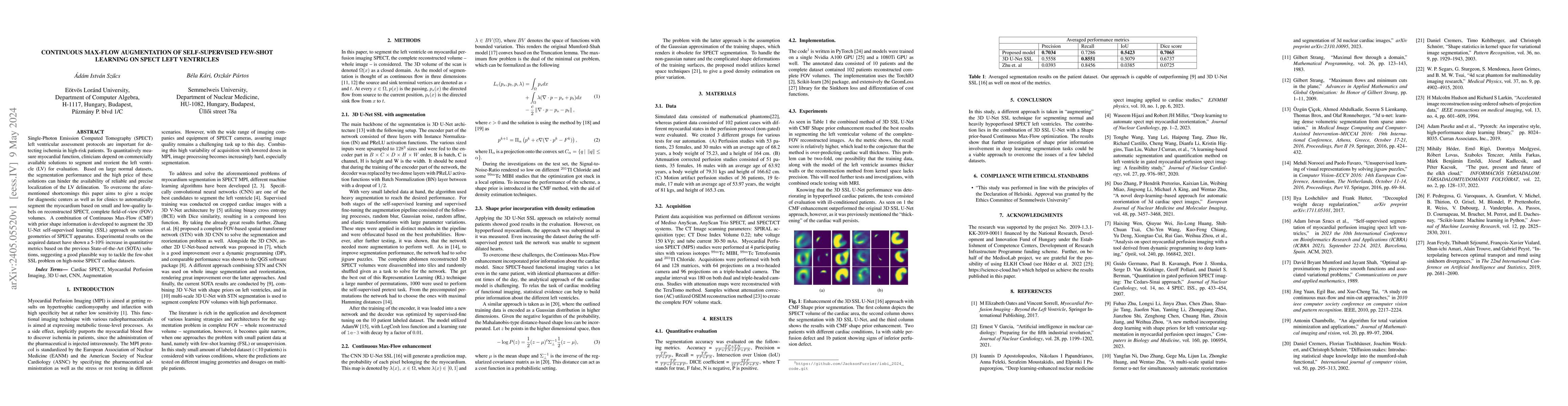 This paper proposes a self-supervised few-shot learning approach combining Continuous Max-Flow augmentation with prior shape information to improve the automatic segmentation of left ventricles in SPECT images, achieving a 5-10% performance increase over existing methods. The method aims to provide a cost-effective solution for reliable myocardial function evaluation.