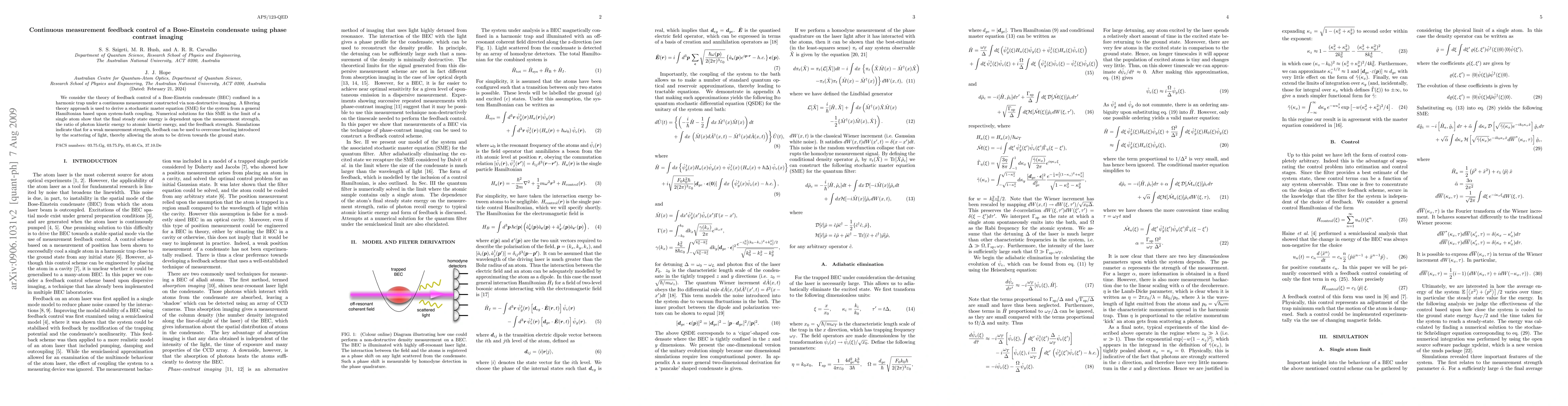 This paper presents a theoretical framework for continuous measurement feedback control of a Bose-Einstein condensate using phase contrast imaging. The authors derive a stochastic master equation to model the system's behavior under non-destructive measurements, demonstrating that weak feedback can mitigate heating effects and drive the system towards its ground state.