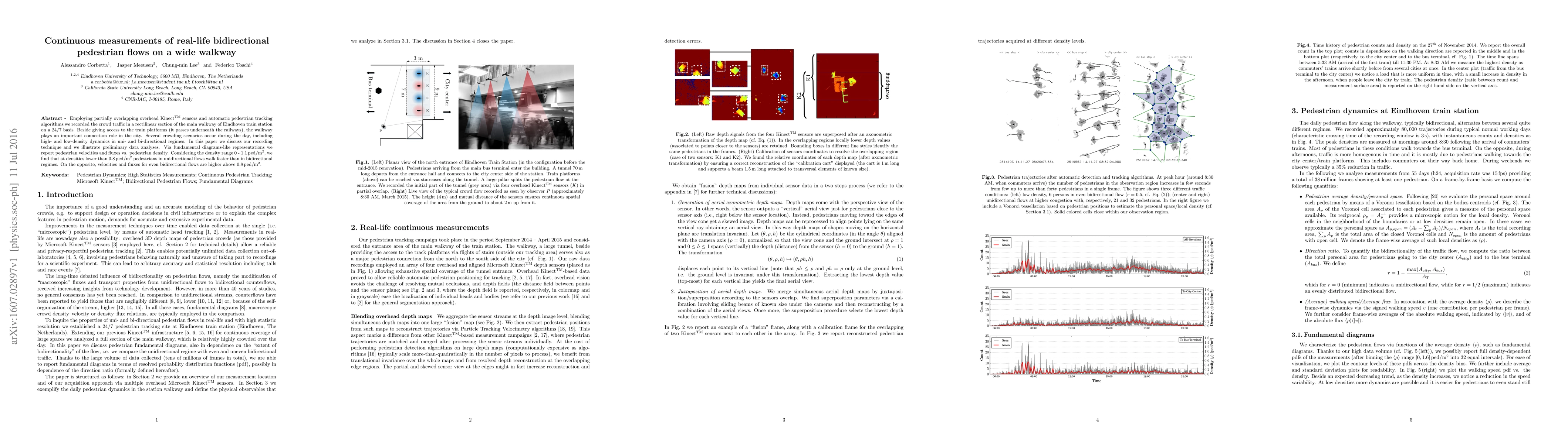This paper details a continuous 24/7 monitoring of pedestrian flows on a main walkway at Eindhoven train station using Kinect sensors and tracking algorithms. Preliminary analyses reveal that pedestrian velocities and fluxes vary with density, with unidirectional flows faster below 0.8 ped/m², while bidirectional flows exceed them above this density.
