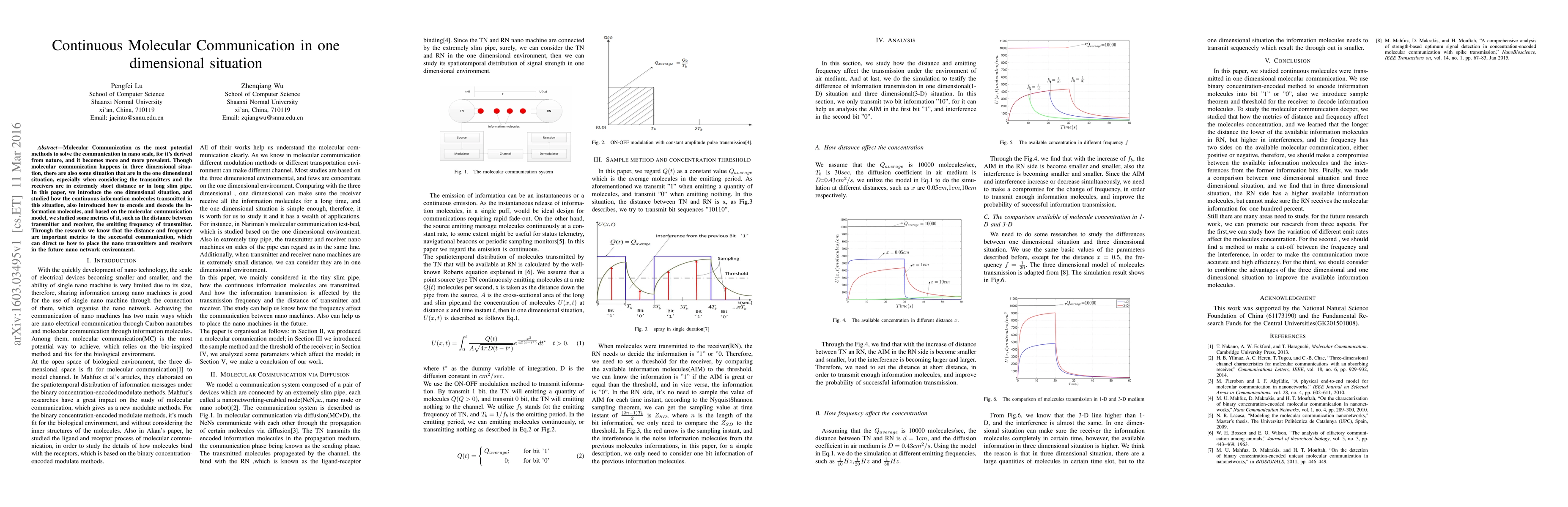 Molecular Communication as the most potential methods to solve the communication in nano scale, for it's derived from nature, and it becomes more and more prevalent. Though molecular communication happens in three dimensional situation, there are also some situation that are in the one dimensional situation, especially when considering the transmitters and the receivers are in extremely short distance or in long slim pipe. In this paper, we introduce the one dimensional situation, and studied how the continuous information molecules transmitted in this situation, also introduced how to encode and decode the information molecules, and based on the molecular communication model, we studied some metrics of it, such as the distance between transmitter and receiver, the emitting frequency of transmitter. Through the research we know that the distance and frequency are important metrics to the successful communication, which can direct us how to place the nano transmitters and receivers in the future nano network environment.