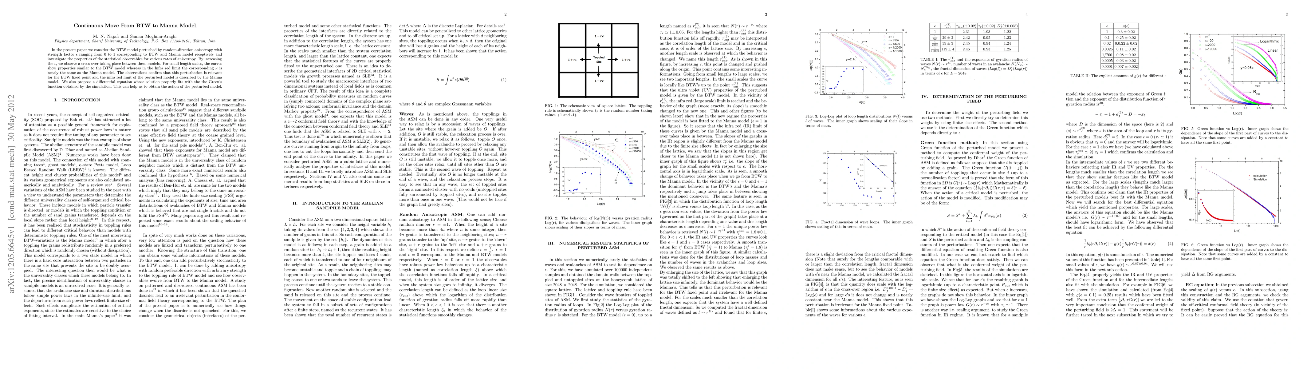 In the present paper we consider the BTW model perturbed by random-direction anisotropy with strength factor \epsilon ranging from 0 to 1 corresponding to BTW and Manna model receptively and investigate the properties of the statistical observables for various rates of anisotropy. By increasing the \epsilon, we observe a cross-over taking place between these models. For small length scales, the curves show properties similar to the BTW model whereas in the Infra red limit the corresponding \kappa is nearly the same as the Manna model. The observations confirm that this perturbation is relevant for the BTW fixed point and the infra red limit of the perturbed model is described by the Manna model. We also propose a differential equation whose solution properly fits with the the Green's function obtained by the simulation. This can help us to obtain the action of the perturbed model.