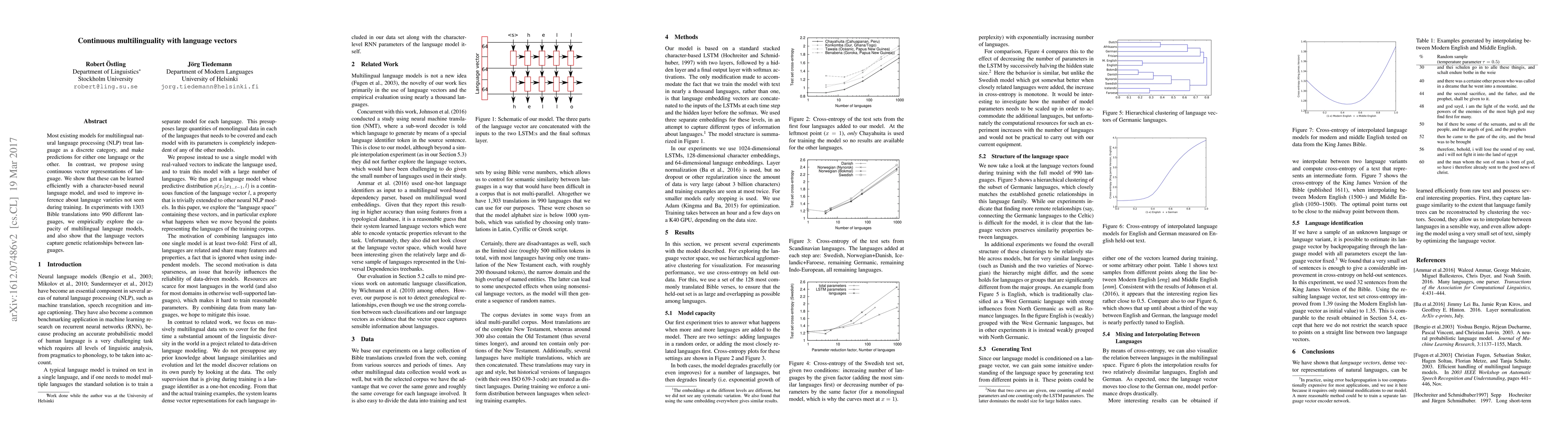 Most existing models for multilingual natural language processing (NLP) treat language as a discrete category, and make predictions for either one language or the other. In contrast, we propose using continuous vector representations of language. We show that these can be learned efficiently with a character-based neural language model, and used to improve inference about language varieties not seen during training. In experiments with 1303 Bible translations into 990 different languages, we empirically explore the capacity of multilingual language models, and also show that the language vectors capture genetic relationships between languages.