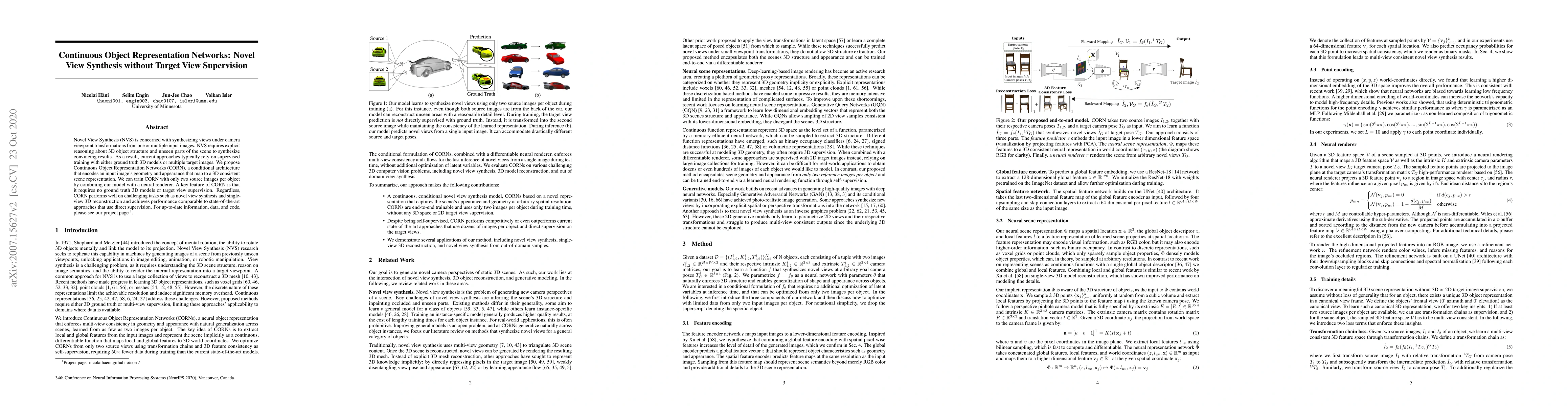 Continuous Object Representation Networks (CORN) enable novel view synthesis without requiring ground truth 3D models or target view supervision, achieving performance comparable to supervised methods using only two source images per object. The model combines an input image's geometry and appearance into a 3D consistent scene representation, trained with a neural renderer.