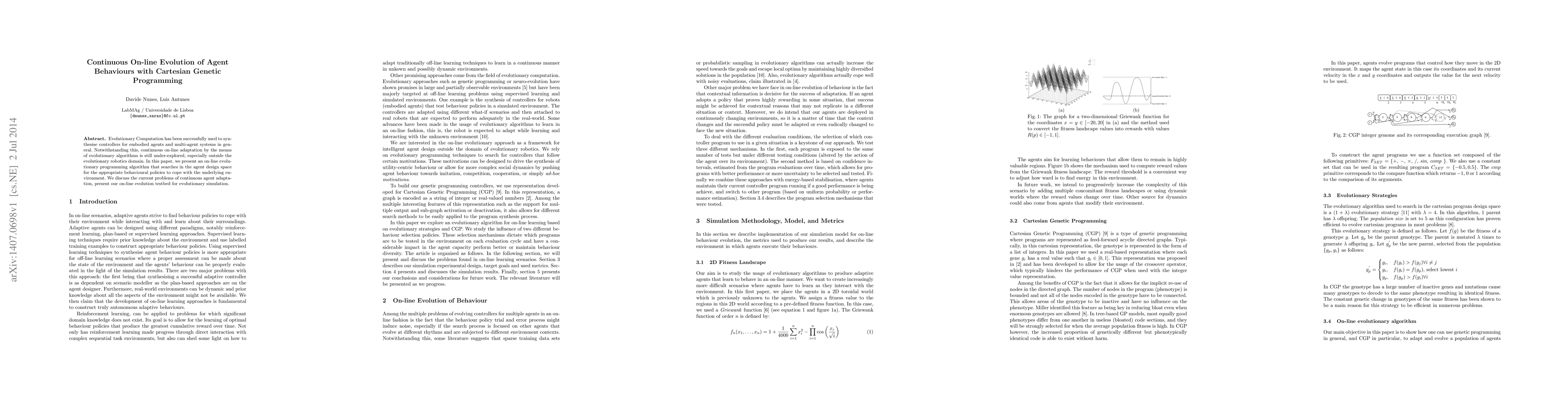 Evolutionary Computation has been successfully used to synthesise controllers for embodied agents and multi-agent systems in general. Notwithstanding this, continuous on-line adaptation by the means of evolutionary algorithms is still under-explored, especially outside the evolutionary robotics domain. In this paper, we present an on-line evolutionary programming algorithm that searches in the agent design space for the appropriate behavioural policies to cope with the underlying environment. We discuss the current problems of continuous agent adaptation, present our on-line evolution testbed for evolutionary simulation.