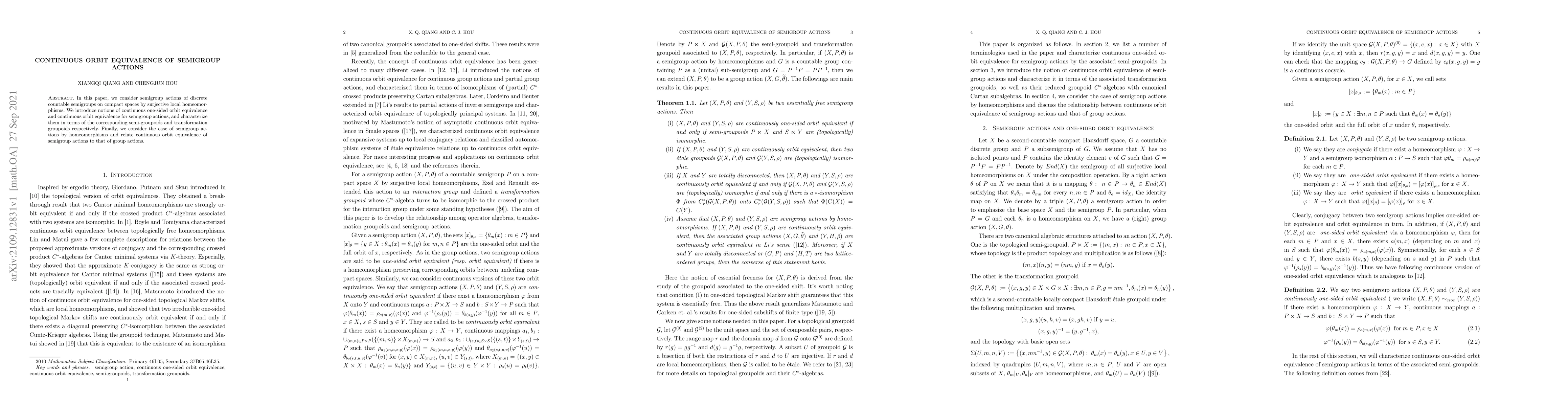 This paper defines continuous one-sided and full orbit equivalence for discrete semigroup actions on compact spaces via local homeomorphisms and characterizes these concepts through semi-groupoids and transformation groupoids, concluding with a comparison to group actions.