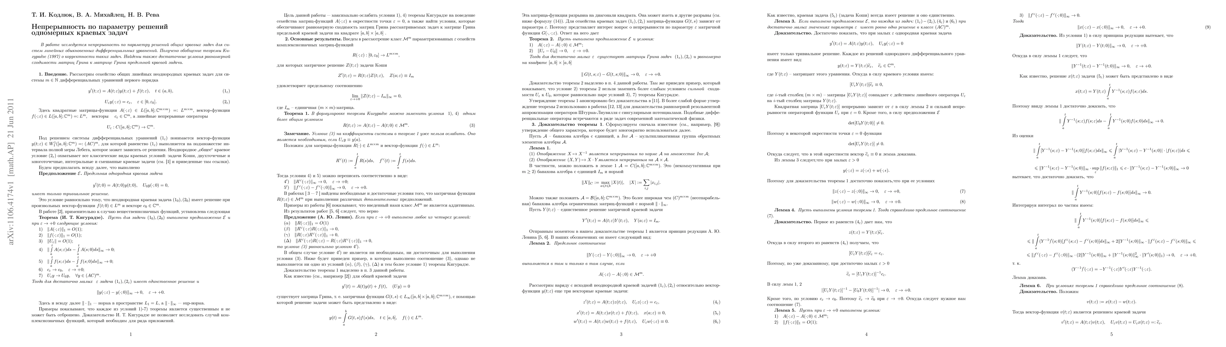 This paper explores continuous parameter dependence in solutions of one-dimensional boundary value problems for ordinary linear differential systems, extending Kiguradze's theorem and establishing sufficient conditions for the uniform convergence of Green matrices.