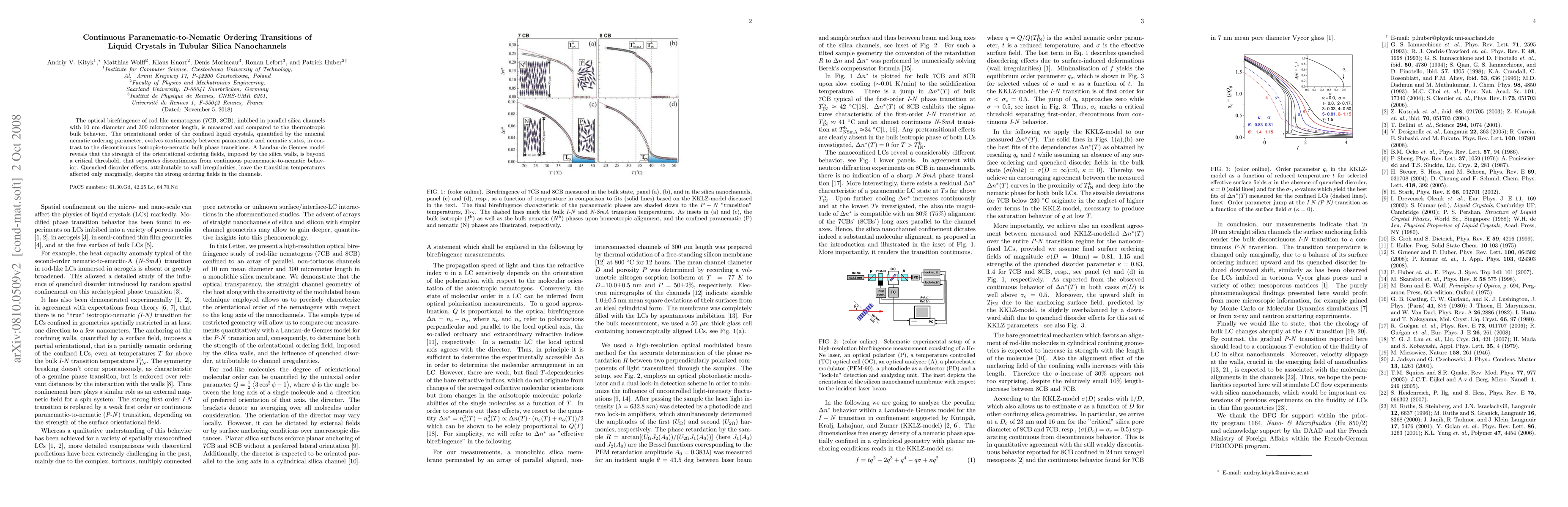 This paper investigates the continuous transition between paranematic and nematic states in rod-like nematogens confined within silica nanochannels, contrasting with the usual discontinuous bulk phase transitions. The study finds that strong orientational ordering fields from the silica walls induce a continuous transition, while wall irregularities have minimal impact on transition temperatures.