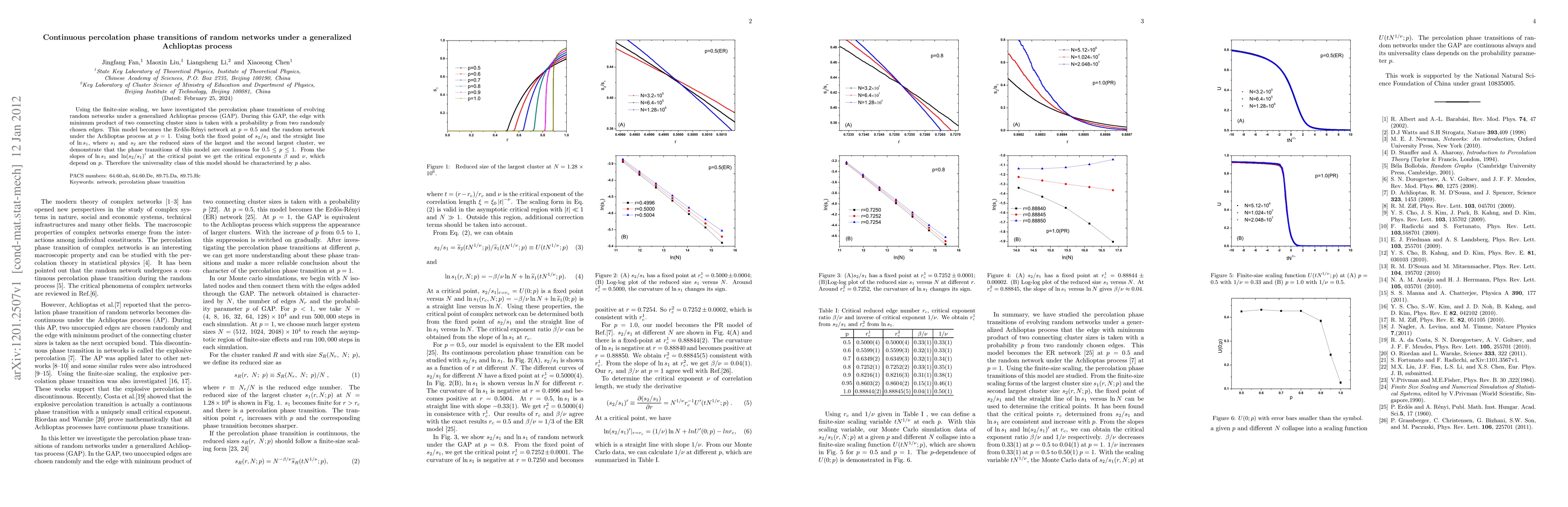 Using the finite-size scaling, we have investigated the percolation phase transitions of evolving random networks under a generalized Achlioptas process (GAP). During this GAP, the edge with minimum product of two connecting cluster sizes is taken with a probability $p$ from two randomly chosen edges. This model becomes the Erd\H os-R\'enyi network at $p=0.5$ and the random network under the Achlioptas process at $p=1$. Using both the fixed point of $s_2/s_1$ and the straight line of $\ln s_1$, where $s_1$ and $s_2$ are the reduced sizes of the largest and the second largest cluster, we demonstrate that the phase transitions of this model are continuous for $0.5 \le p \le 1$. From the slopes of $\ln s_1$ and $\ln (s_2/s_1)'$ at the critical point we get the critical exponents $\beta$ and $\nu$, which depend on $p$. Therefore the universality class of this model should be characterized by $p$ also.