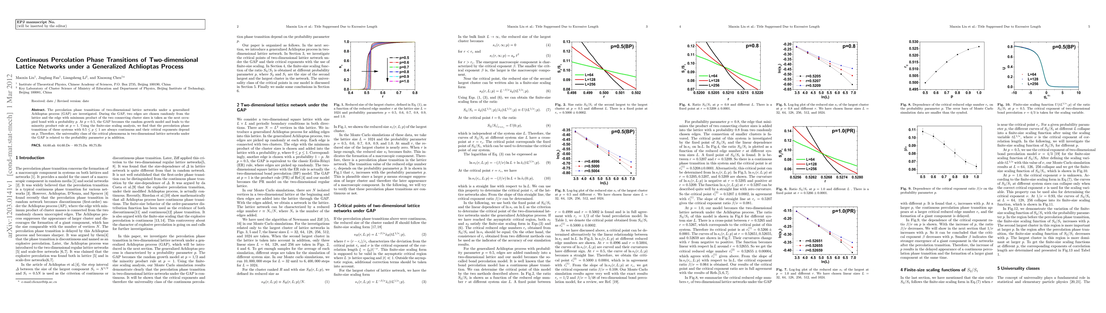 This paper investigates the continuous percolation phase transitions in two-dimensional lattice networks under a generalized Achlioptas process, finding that the transitions are always continuous for $0.5 \le p \le 1$ and that the critical exponents depend on the probability parameter $p$, establishing a relationship between $p$ and the universality class of the critical phenomena.