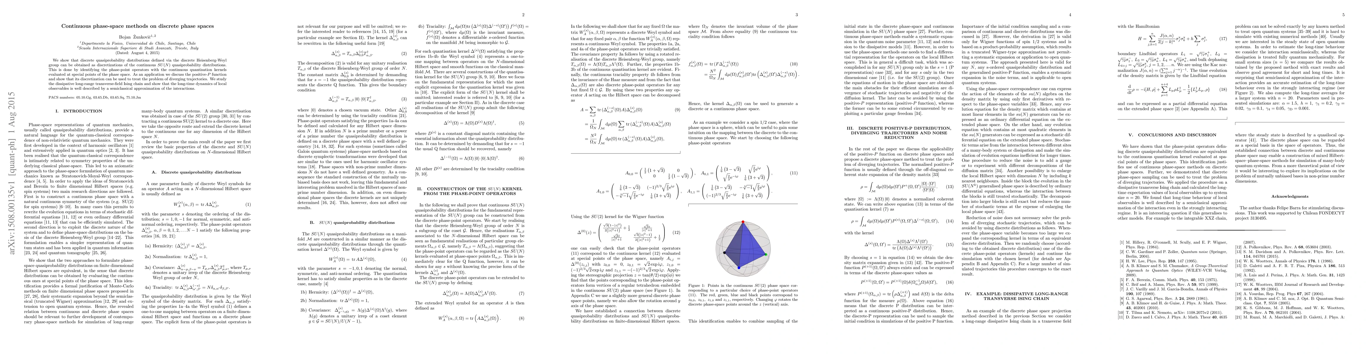 We show that discrete quasiprobability distributions defined via the discrete Heisenberg-Weyl group can be obtained as discretizations of the continuous $SU(N)$ quasiprobability distributions. This is done by identifying the phase-point operators with the continuous quantisation kernels evaluated at special points of the phase space. As an application we discuss the positive-P function and show that its discretization can be used to treat the problem of diverging trajectories. We study the dissipative long-range transverse-field Ising chain and show that the long-time dynamics of local observables is well described by a semiclassical approximation of the interactions.