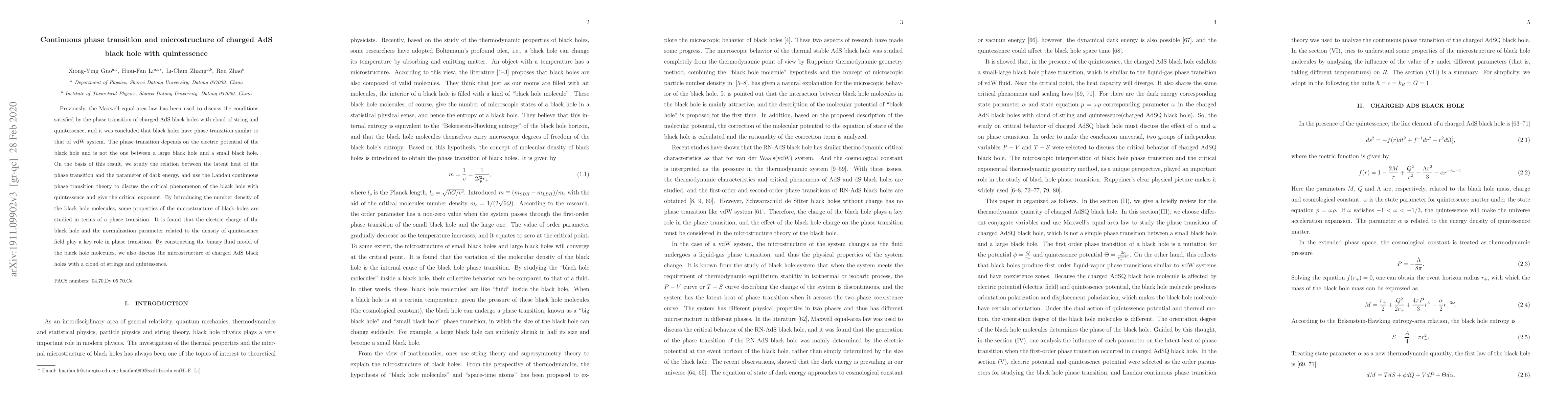 This paper investigates the continuous phase transition in charged AdS black holes with quintessence, showing similarities to van der Waals systems. It examines the relationship between latent heat and dark energy parameters, applying Landau theory to determine critical exponents and explore the microstructure of black holes.
