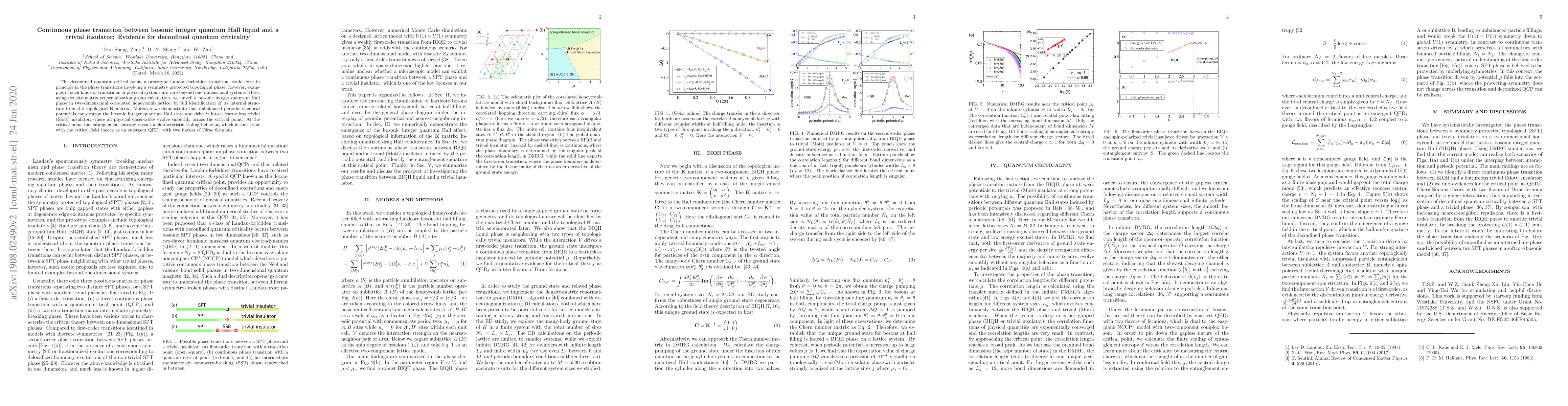 This paper identifies a bosonic integer quantum Hall phase in a two-dimensional honeycomb lattice and demonstrates its transition to a trivial insulator under imbalanced chemical potentials, revealing deconfined quantum criticality with a characteristic scaling behavior in entanglement entropy, akin to emergent QED$_3$.