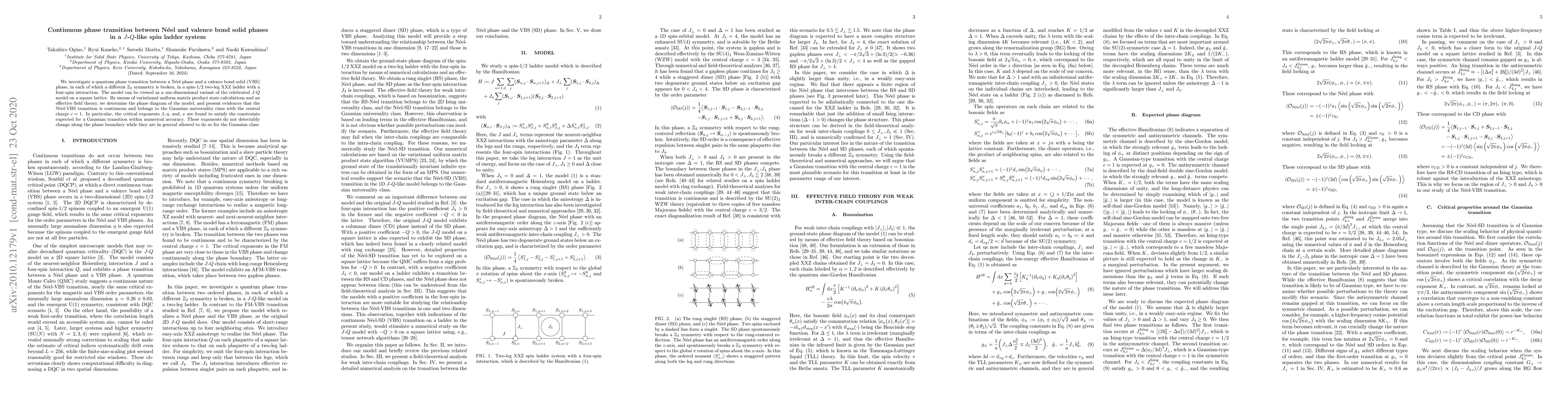This paper investigates a continuous quantum phase transition between Neel and valence bond solid phases in a spin-1/2 two-leg XXZ ladder system, employing variational calculations and effective field theory. The transition is shown to belong to the Gaussian universality class with central charge c=1, characterized by consistent critical exponents.