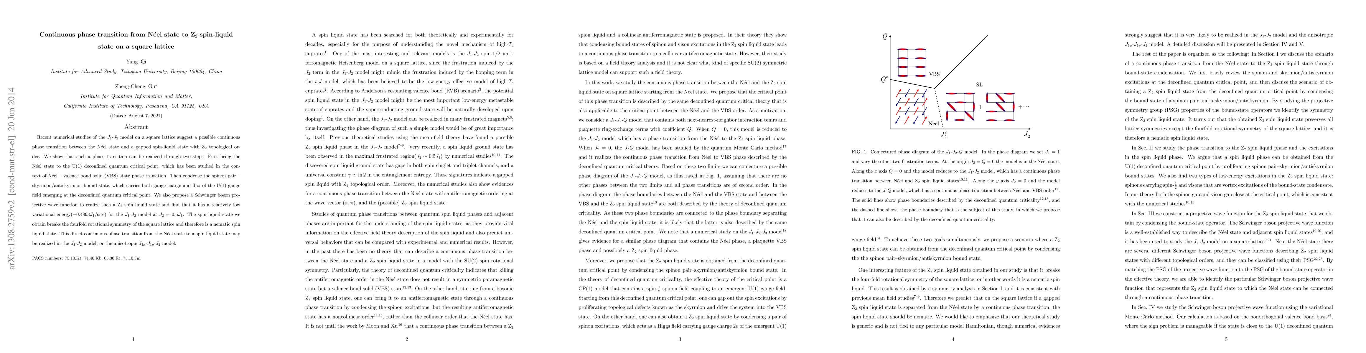 This paper investigates a continuous phase transition in the $J_1$-$J_2$ model on a square lattice, transitioning from a N\'eel state to a Z$_2$ spin liquid state via a U(1) deconfined quantum critical point, followed by condensation of spinon pair skyrmions. The proposed Z$_2$ spin liquid state is a nematic phase with a low variational energy.