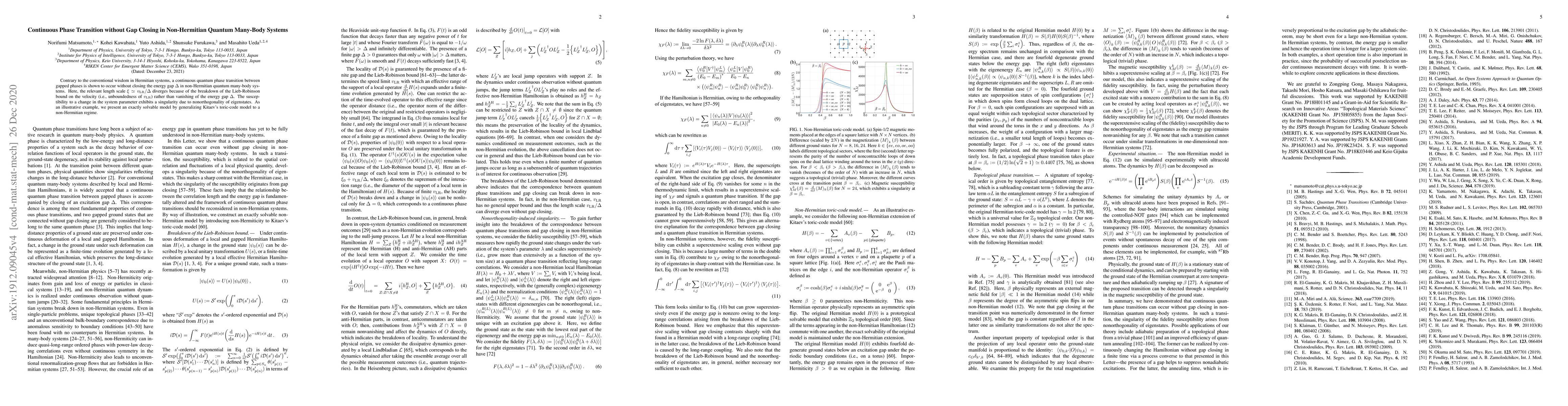 This paper demonstrates a continuous quantum phase transition in non-Hermitian many-body systems without closing the energy gap. The transition is characterized by a diverging length scale due to the breakdown of the Lieb-Robinson bound, leading to a singularity in the system's susceptibility. An example is provided by a generalized non-Hermitian Kitaev toric-code model.