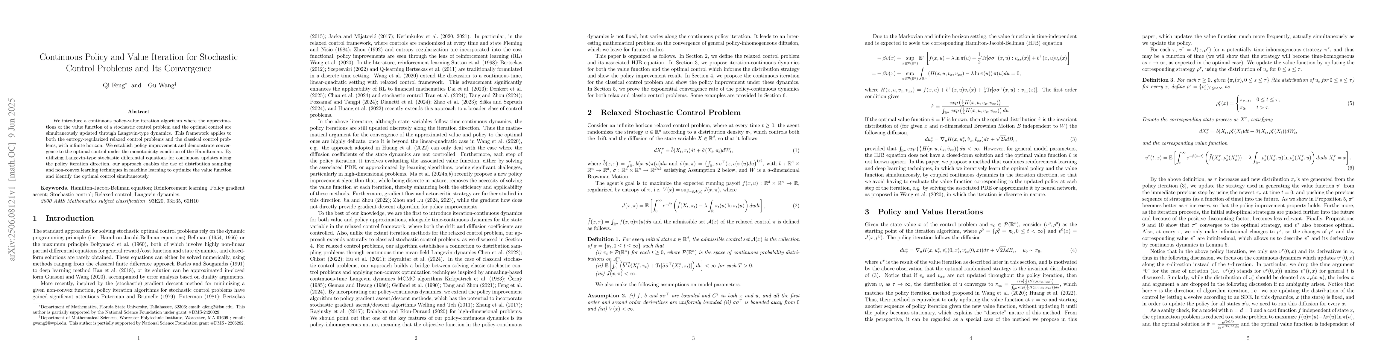 This research introduces a continuous policy-value iteration algorithm that simultaneously updates value function approximations and optimal control using Langevin-type dynamics for stochastic control problems.