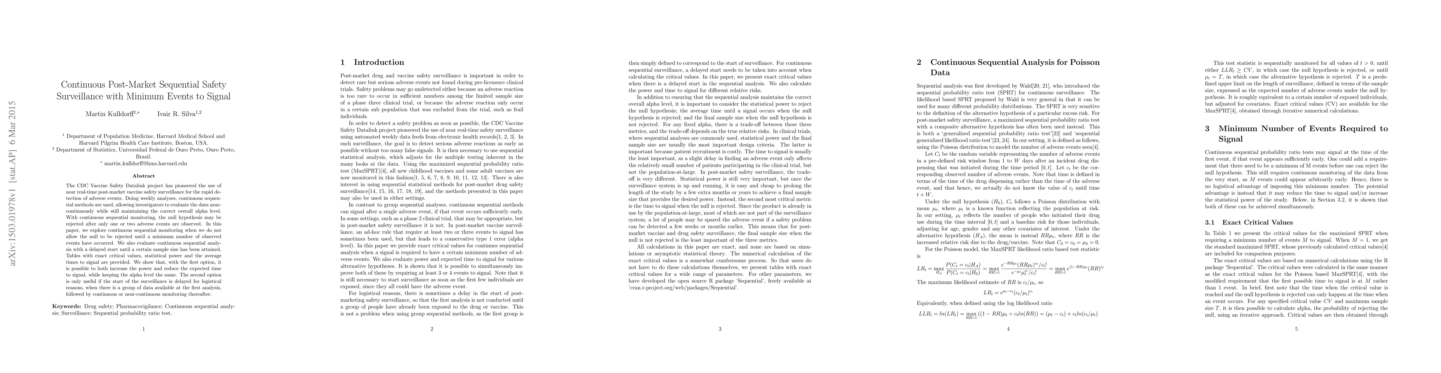 This paper explores continuous sequential methods for post-market vaccine safety surveillance, emphasizing the use of minimum observed events to signal adverse reactions. It demonstrates that starting surveillance with a minimum event threshold can increase power and reduce signal times while maintaining the alpha level, and discusses the utility of delayed starts for logistical reasons.