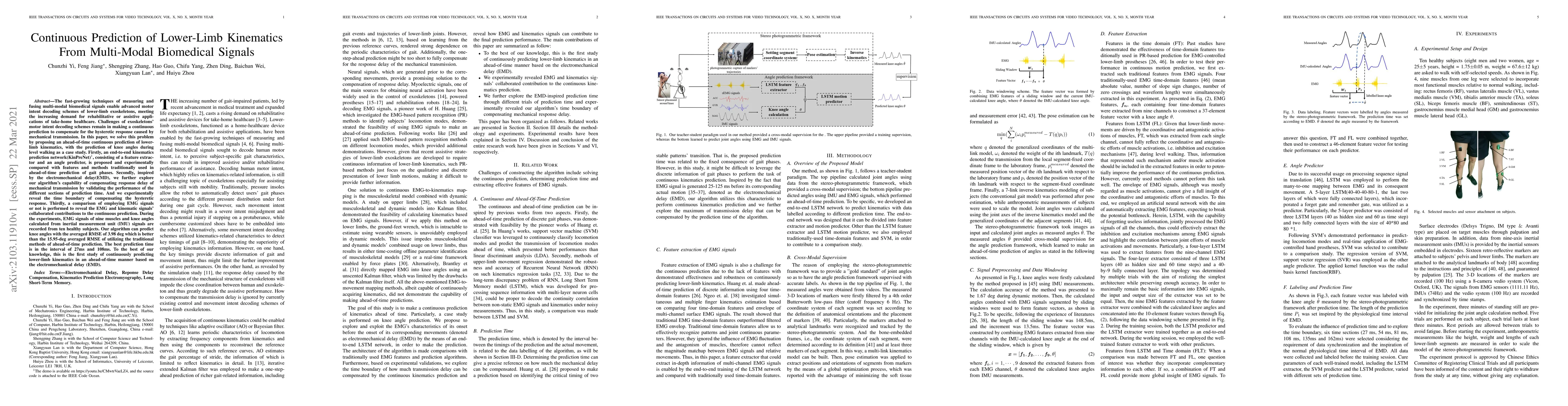 This paper proposes a novel end-to-end network, KinPreNet, for continuous prediction of lower limb kinematics, specifically knee angles during walking, using multi-modal biomedical signals. It demonstrates the network's ability to compensate for mechanical transmission delays and evaluates the contributions of EMG and kinematic signals to the prediction.
