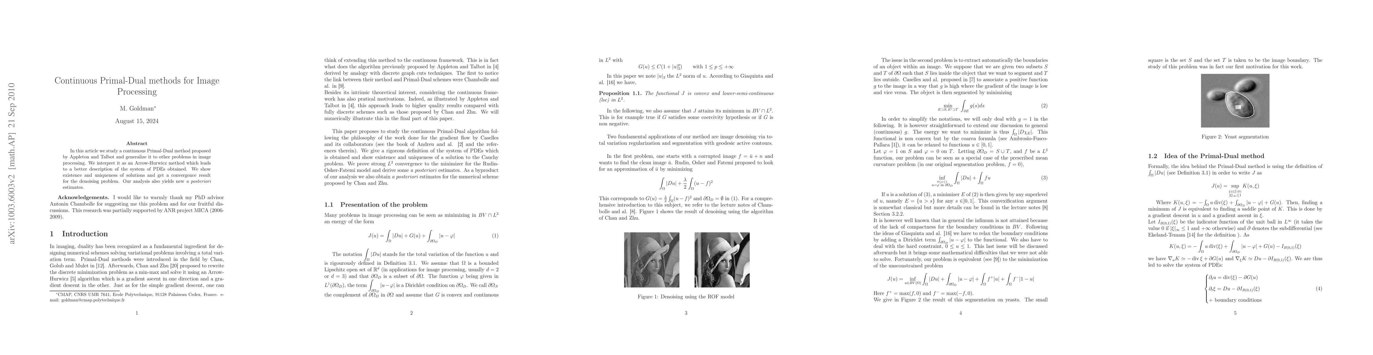 This paper generalizes the continuous Primal-Dual method for image processing, interpreting it as an Arrow-Hurwicz method to better describe the resulting PDEs. It establishes the existence, uniqueness, and convergence of solutions for the denoising problem, along with new a posteriori estimates.