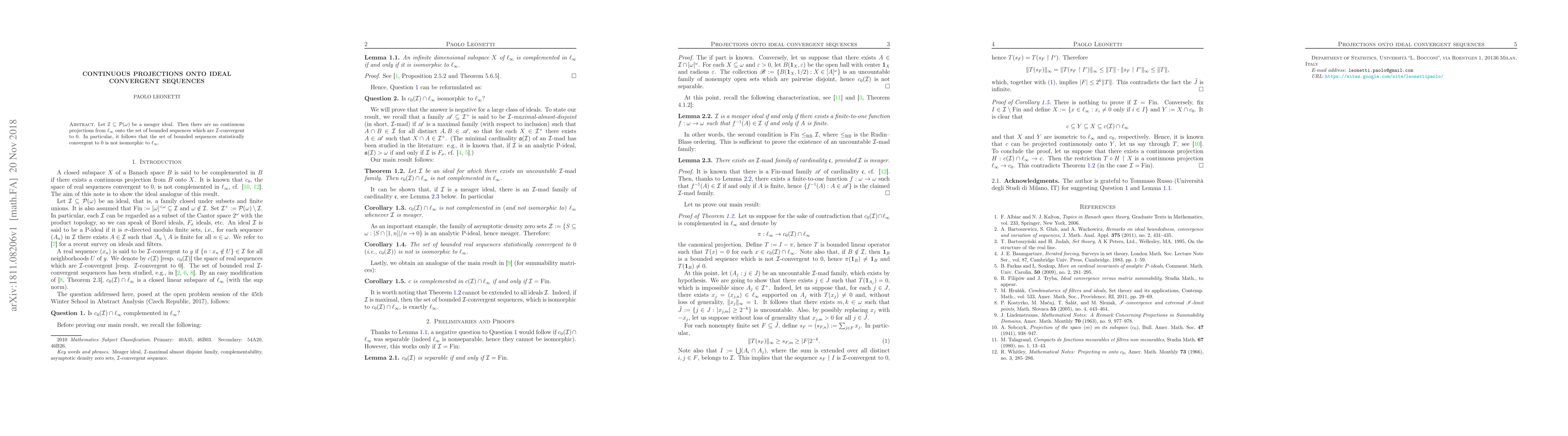 There are no continuous projections from $ extit{l_ ext{∞}}$ onto sequences convergent to $0$ in a meager ideal, disproving the isomorphism of statistically convergent sequences to $ extit{l_ ext{∞}}}