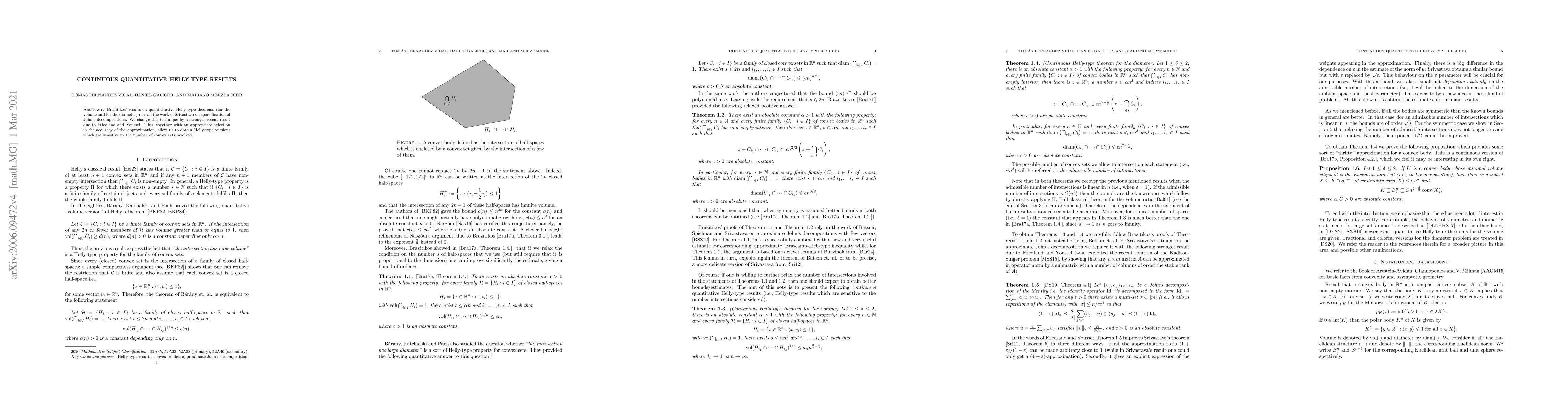 This paper presents improved quantitative Helly-type theorems using a technique from Friedland and Youssef instead of Srivastava's sparsification, achieving sensitivity to the number of convex sets through careful approximation selection.