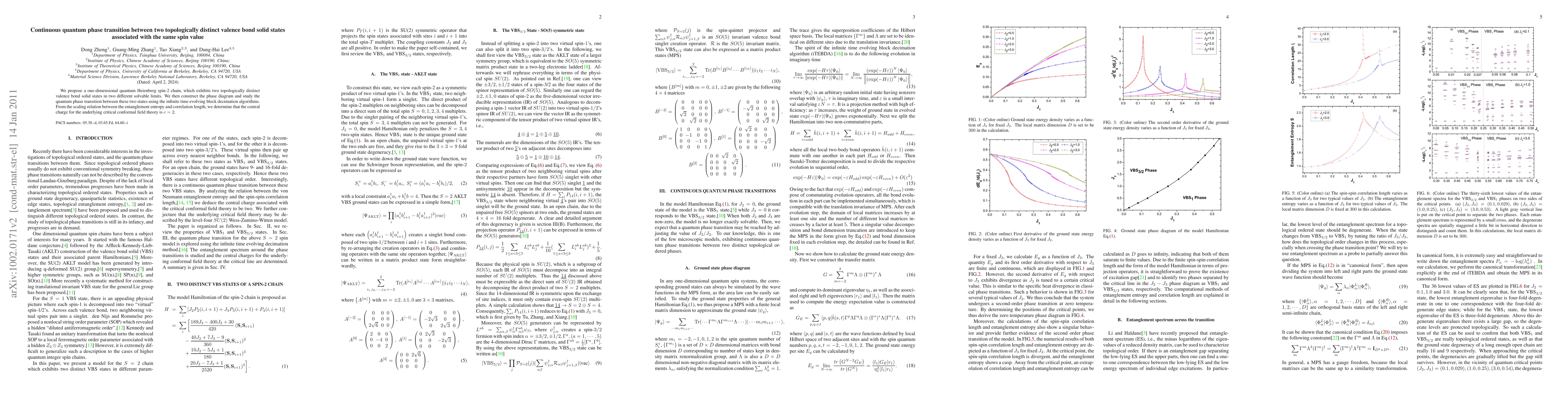 This research proposes a one-dimensional spin-2 Hamiltonian displaying two topologically distinct valence bond solid states, analyzing the continuous quantum phase transition between them using evolving block decimation algorithms and determining a critical central charge of $c=2$ for the associated conformal field theory.