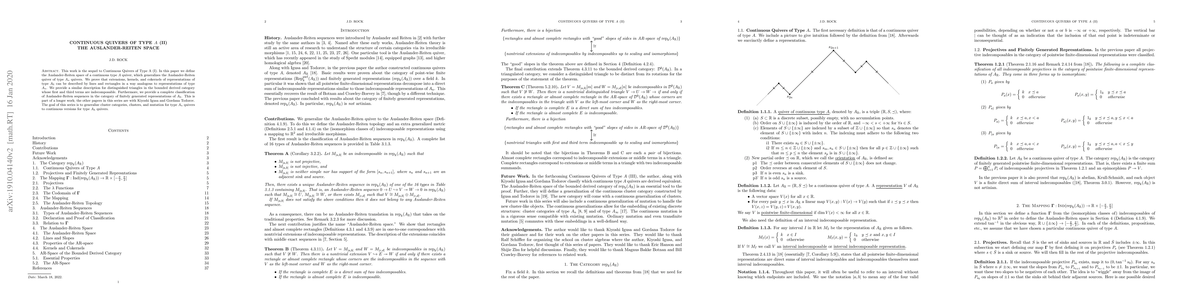 The paper defines the Auslander-Reiten space for continuous type $A_{\mathbb{R}}$ quivers, generalizing the Auslander-Reiten quiver of type $A_n$ quivers. It establishes a description of extensions, kernels, and cokernels of representations using lines and rectangles in the bounded derived category, similar to representations of type $A_n$.