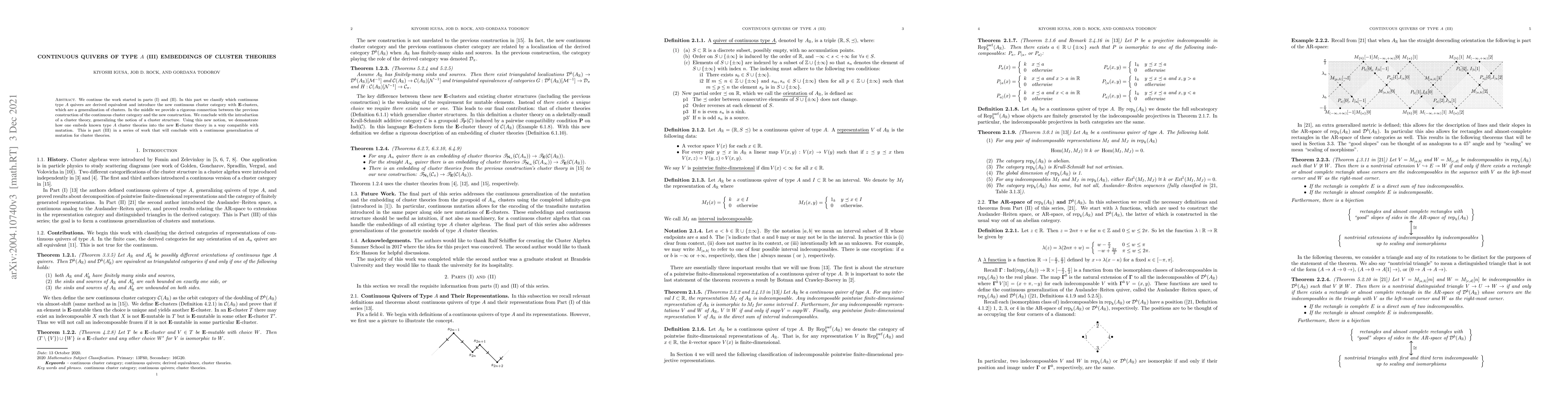 We continue the work started in parts (I) and (II). In this part we classify which continuous type A quivers are derived equivalent and introduce the new continuous cluster category with E-clusters, which are a generalization of clusters. In the middle we provide a rigorous connection between the previous construction of the continuous cluster category and the new construction. We conclude with the introduction of a cluster theory, generalizing the notion of a cluster structure. Using this new notion, we demonstrate how one embeds known type A cluster theories into the new E-cluster theory in a way compatible with mutation. This is part (III) in a series of work that will conclude with a continuous generalization of mutation for cluster theories.