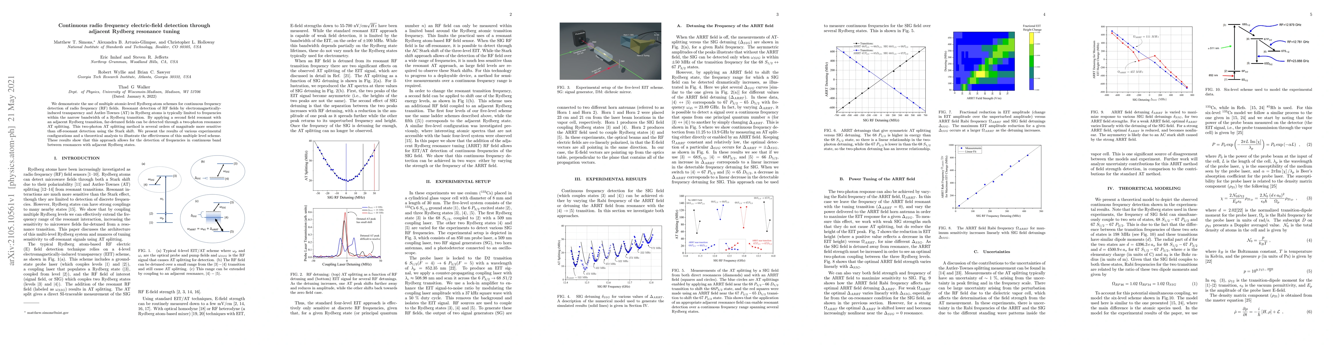 This paper demonstrates a novel method for continuous radio frequency detection using multiple Rydberg-atom schemes, achieving sensitivity several orders of magnitude higher than traditional methods. By tuning to adjacent Rydberg transitions via two-photon resonance, it enables detection across a broader frequency range.