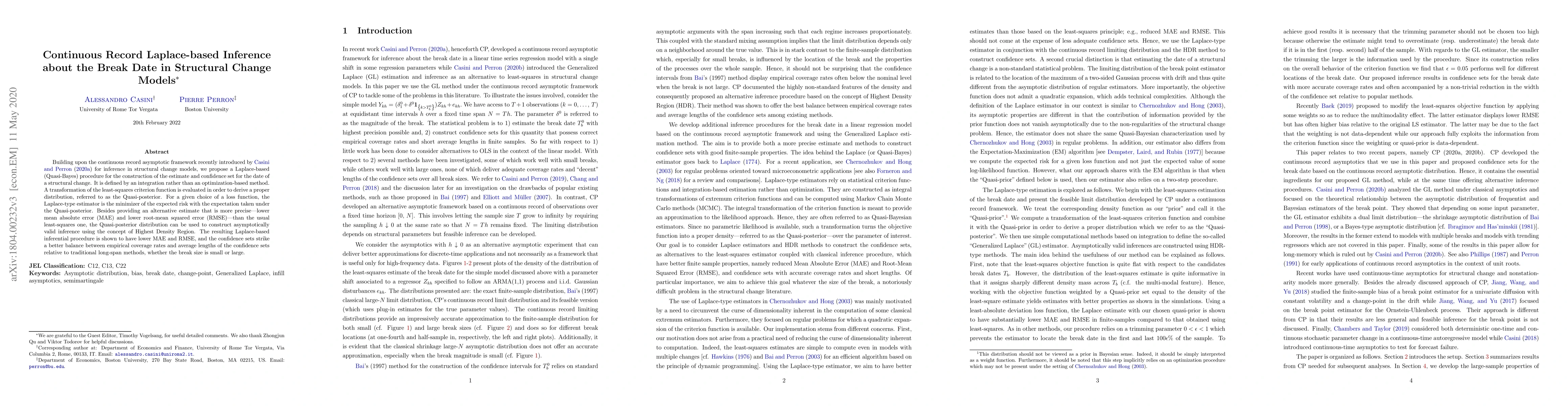 Building upon the continuous record asymptotic framework recently introduced by Casini and Perron (2018a) for inference in structural change models, we propose a Laplace-based (Quasi-Bayes) procedure for the construction of the estimate and confidence set for the date of a structural change. It is defined by an integration rather than an optimization-based method. A transformation of the least-squares criterion function is evaluated in order to derive a proper distribution, referred to as the Quasi-posterior. For a given choice of a loss function, the Laplace-type estimator is the minimizer of the expected risk with the expectation taken under the Quasi-posterior. Besides providing an alternative estimate that is more precise|lower mean absolute error (MAE) and lower root-mean squared error (RMSE)|than the usual least-squares one, the Quasi-posterior distribution can be used to construct asymptotically valid inference using the concept of Highest Density Region. The resulting Laplace-based inferential procedure is shown to have lower MAE and RMSE, and the confidence sets strike the best balance between empirical coverage rates and average lengths of the confidence sets relative to traditional long-span methods, whether the break size is small or large.