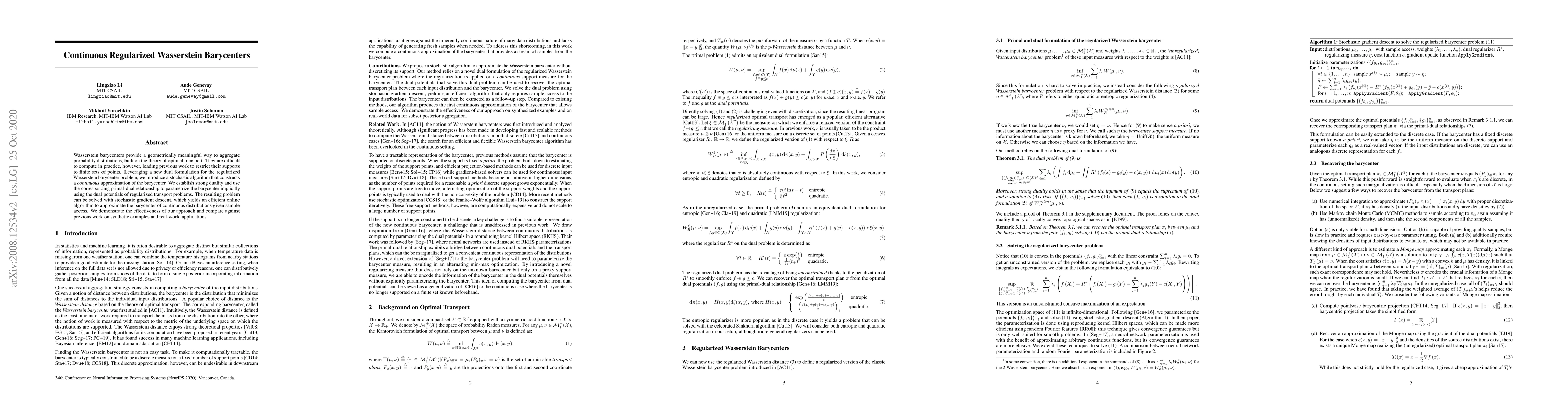 This paper presents a stochastic algorithm for computing continuous regularized Wasserstein barycenters, leveraging a dual formulation to approximate the barycenter of continuous distributions. The method uses stochastic gradient descent to solve the problem efficiently and is shown to be effective through comparisons with previous methods on both synthetic and real-world data.