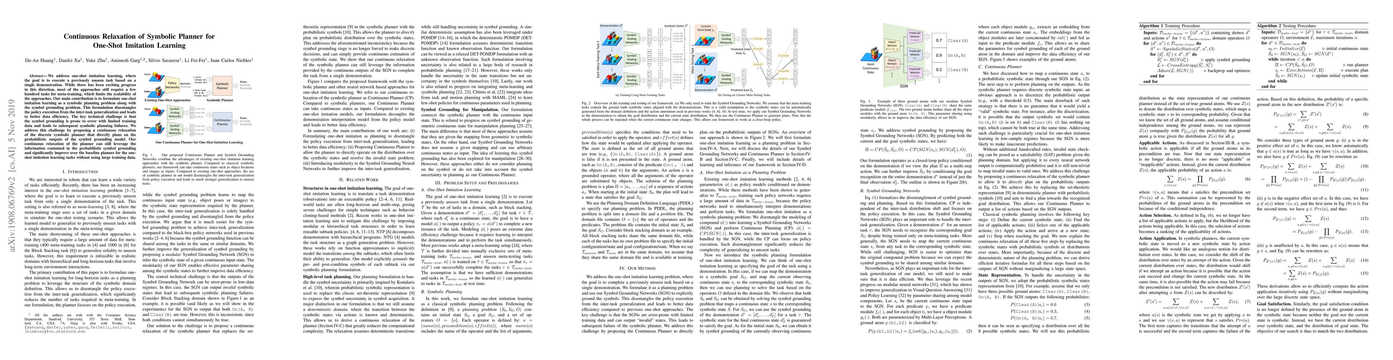This research paper proposes a new approach to one-shot imitation learning that uses symbolic planning to improve data efficiency without requiring large amounts of training data. By relaxing the planner into a continuous version, it can leverage probabilistic symbol grounding and significantly outperform baseline planners.